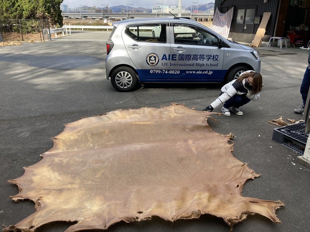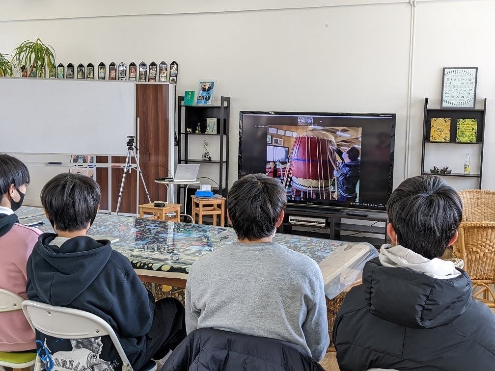 オンライン中継で見学させていただいた工房見学では、皮の張替えの工程の他、張られる前の1頭分の牛の皮、豊臣秀吉に命じられて作られた伝説の和太鼓職人の作った太鼓(作られたのは天保でした)等々、部員たちは食い入るように見ていました。