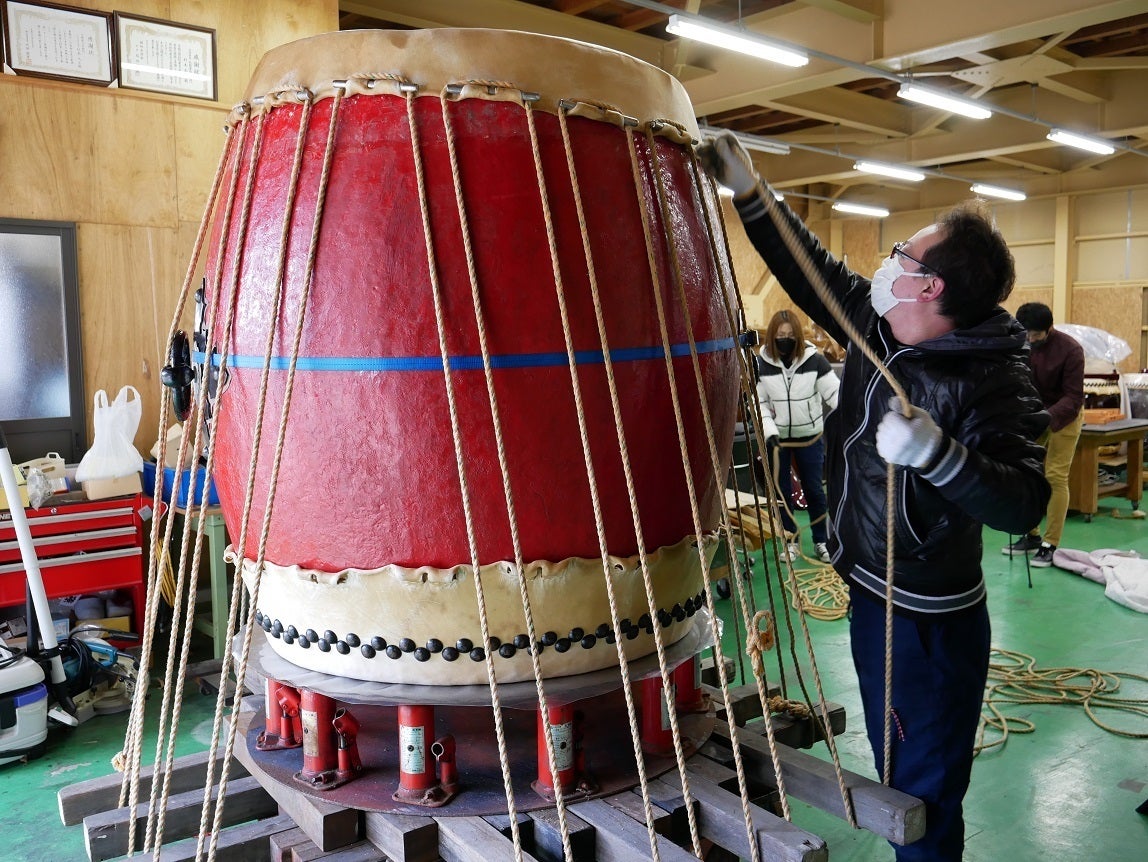 今回大太鼓の皮の張り替えを担当いただいたのは、滋賀県で300年続く太鼓職人の18代目、太鼓屋六右衛門の杉本様です。