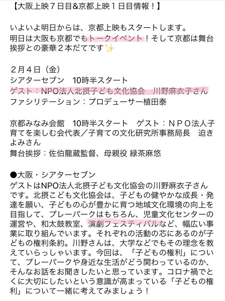 2022/02/04 20:53大阪高校生演劇フェスティバルin池田」主催者の北摂こども文化協会、理事長の川野麻衣子です。応援いただきました皆様、誠にありがとうございます。本クラファン、最終日の本日、別の自主事業の関係で、映画館にて、トークイベントに登壇する機会をいただき、とある映画上映後、映画プロデューサーと対談する形で、観客の皆様の前に立たせていただきました。弊協会をご紹介差し上げる流れの中で、「第21回大阪高校生演劇フェスティバルin池田」のことも紹介させていただき、本クラファンのことにも触れさせていただきました。本日最終日。一人でも多くの方に、皆様が応援くださっている演フェスの存在を知っていただき、一人でも多くの方に共にご支援いただけることを信じて。 もっと見る
