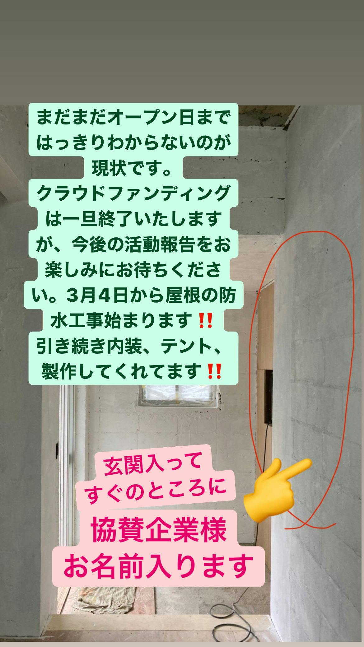 クラウドファンディングはまもなく終了を迎えますが、未だ工事の目処が立っておりません(T_T)と言うのも、コロナの影響でキッチンの搬入日が定らず中々進められない箇所が多く、その間に雨漏り発覚してパタパタと手配等々で活動報告も遅くなり申し訳ございません。
