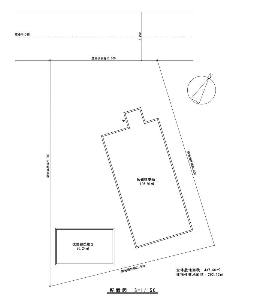 母屋35坪位、離れ10坪、庭50坪を駐車場に。