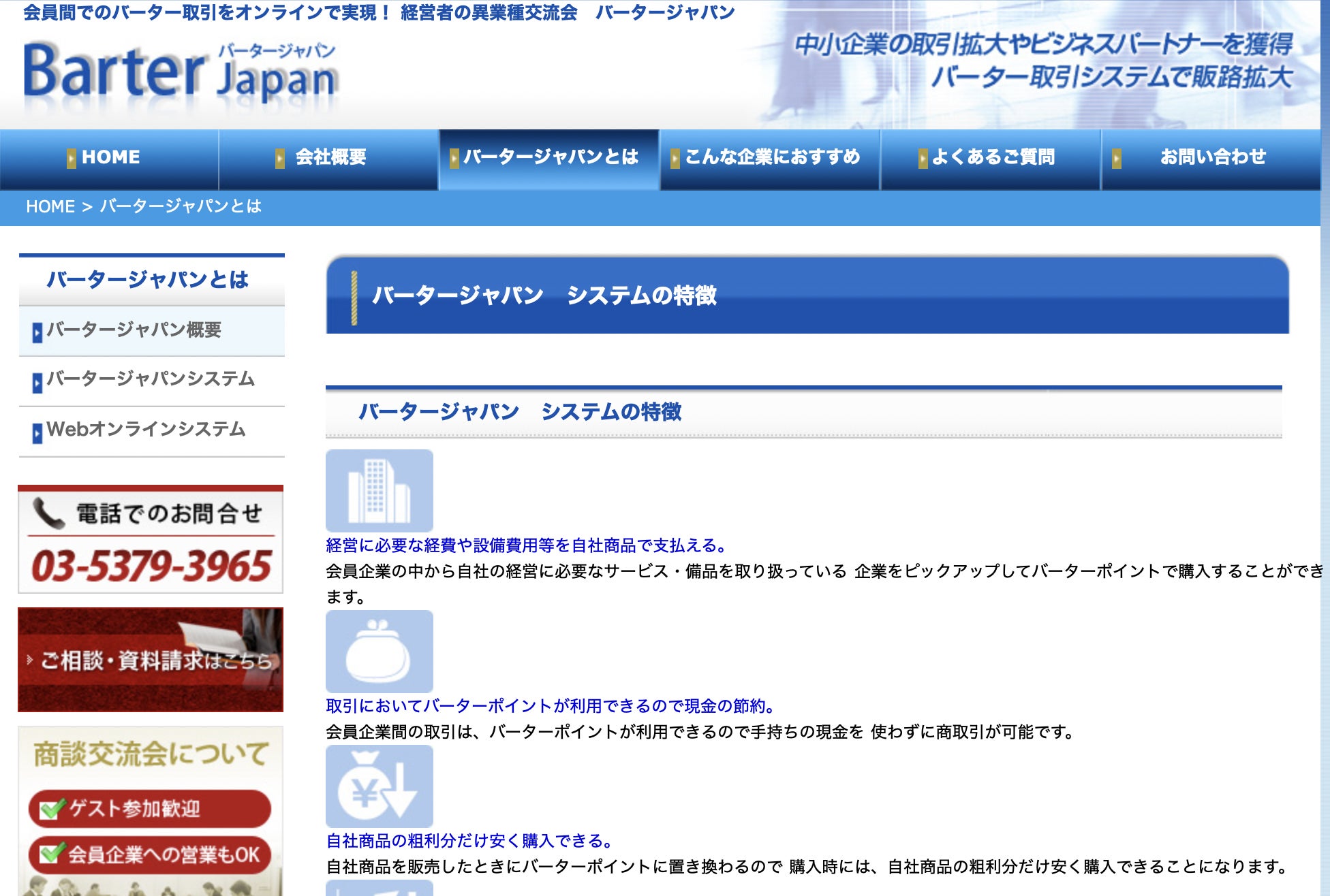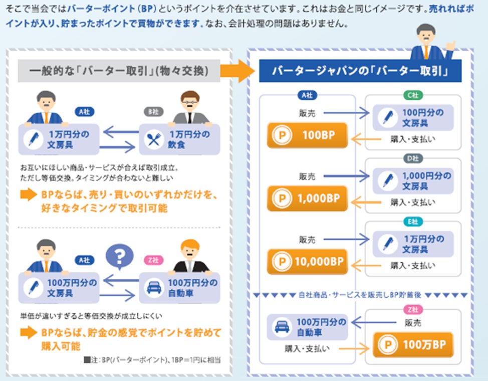 具体的には、「自社の商品(サービス)と他社の商品(サービス)を、同価値で交換する」システムで、買い物するときに、現金ではなく「自分の会社の商品(サービス)で支払いを行う」のが特徴です。