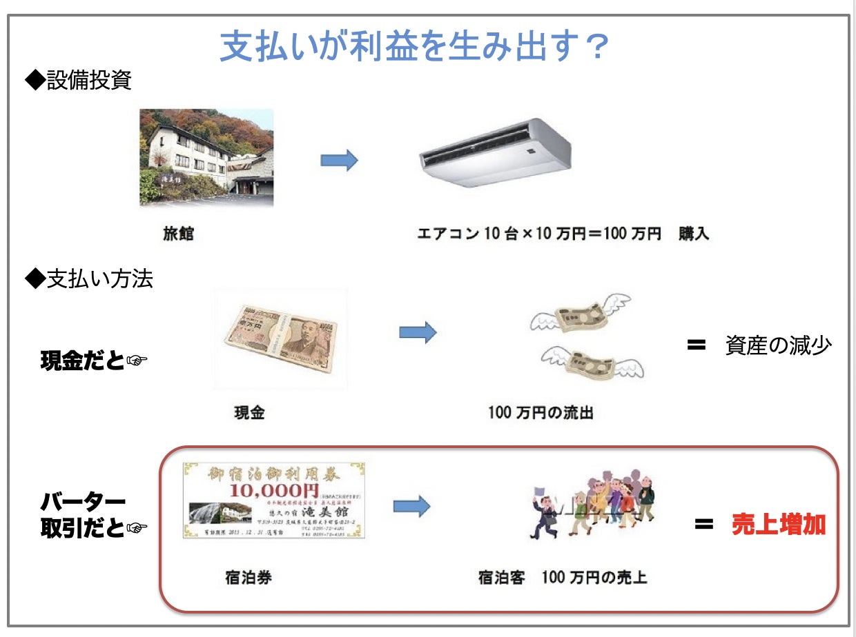例えば、上の図のように、旅館が設備投資に必要な「エアコン」の購入を、バータージャパンで行ったとします。旅館は自らの商品として、「宿泊券」を販売します。現金で購入すると単なる「支出」ですが、バーター取引では自らの「サービス」で支払います。つまり、支払いが「売り上げ」につながるのです。