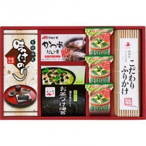 商品内容:アマノほうれん草おみそ汁×3、有明海産味付のり(3切6枚)・マルトモかつおだしの素(8g×3袋)・永谷園お茶づけ海苔(6.3g×3袋)・こだわりふりかけ(6g×3袋)×各1