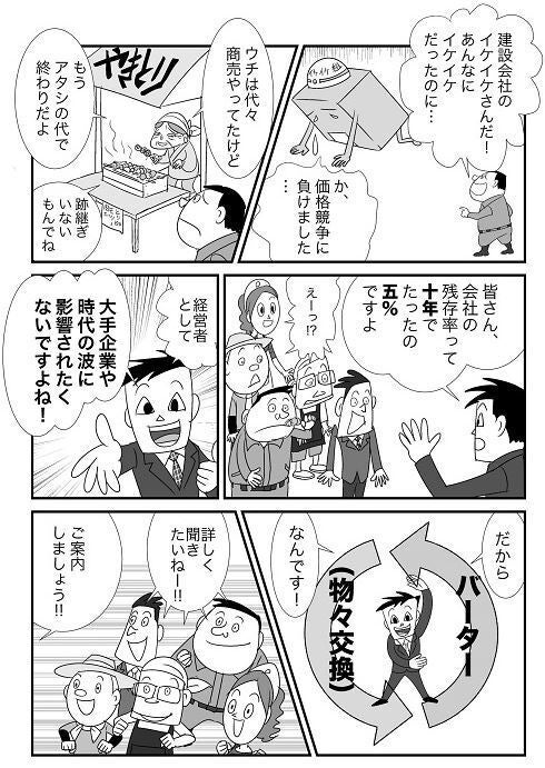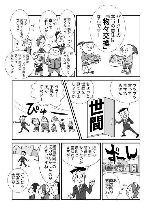 クラウドファンディングを開始して27日目です。皆様のご支援、ご声援、ご協力に感謝申し上げます。【わらしべ長者の物々交換】日本のおとぎ話の『今昔物語集』に登場するわらしべ長者の話は有名です。https://www.youtube.com/watch?v=nSwrWT0S_CU&t=6sある貧乏な男が拾ったワラから次々と物々交換をしていくにつれて、最後は大金持ちになる話です。藁稭(ワラシベ)→みかん→反物→馬→屋敷 という順序で次第によりよい物と物々交換をしていくというお話です。何故次々に物々交換をしていくと最後はお金持ちになっていくかをバータークラブ的に考えてみました。まず、貨幣(現金)ではなくモノで交換するというところにミソがあります。物には仕入れ原価があります。普通仕入れた物には利益を乗せて販売(交換)します。10万円で仕入れた商品を14万円で販売すると粗利は4万円で、粗利率は28.5%となります。物々交換で必要な物を手に入れる場合と、現金で購入する場合ではどこが違うのか。どうして物々交換の方が有利なのか。それは物々交換の方が粗利の分安く手に入れているからです。例えば10万円のパソコンを必要になって購入しなければならなくなった。現金の場合は当然10万円の支出となりますが、前例の粗利率の商品を扱っている人が同じパソコンを物々交換で手に入れると71,428円の現金支出で済みます。いつも物々交換で必要な物やサービスを手に入れる事ができれば、現金よりも粗利の分だけ有利になります。もちろん物々交換で手に入れる場合も、現金と同じ価格でという前提条件が付きますが。わらしべ長者の様にいつも物々交換をしていれば、現金で購入している人に比べて有利になります。遠い昔話にあるように、貨幣経済の現代でも物々交換を見直してみる必要がありそうです。通常の物々交換は相手を探すのがとても難しいですが、バータークラブではそれが容易にできます。バータージャパンfacebookページ ⇒ https://www.facebook.com/barter.japan/