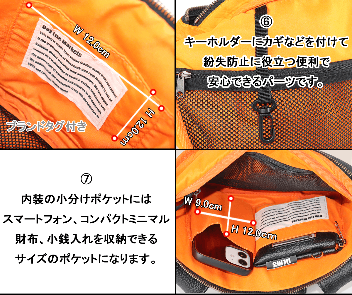 ・小分けポケット×2個、メッシュポケット×1個、キーホルダーストラップ×1個