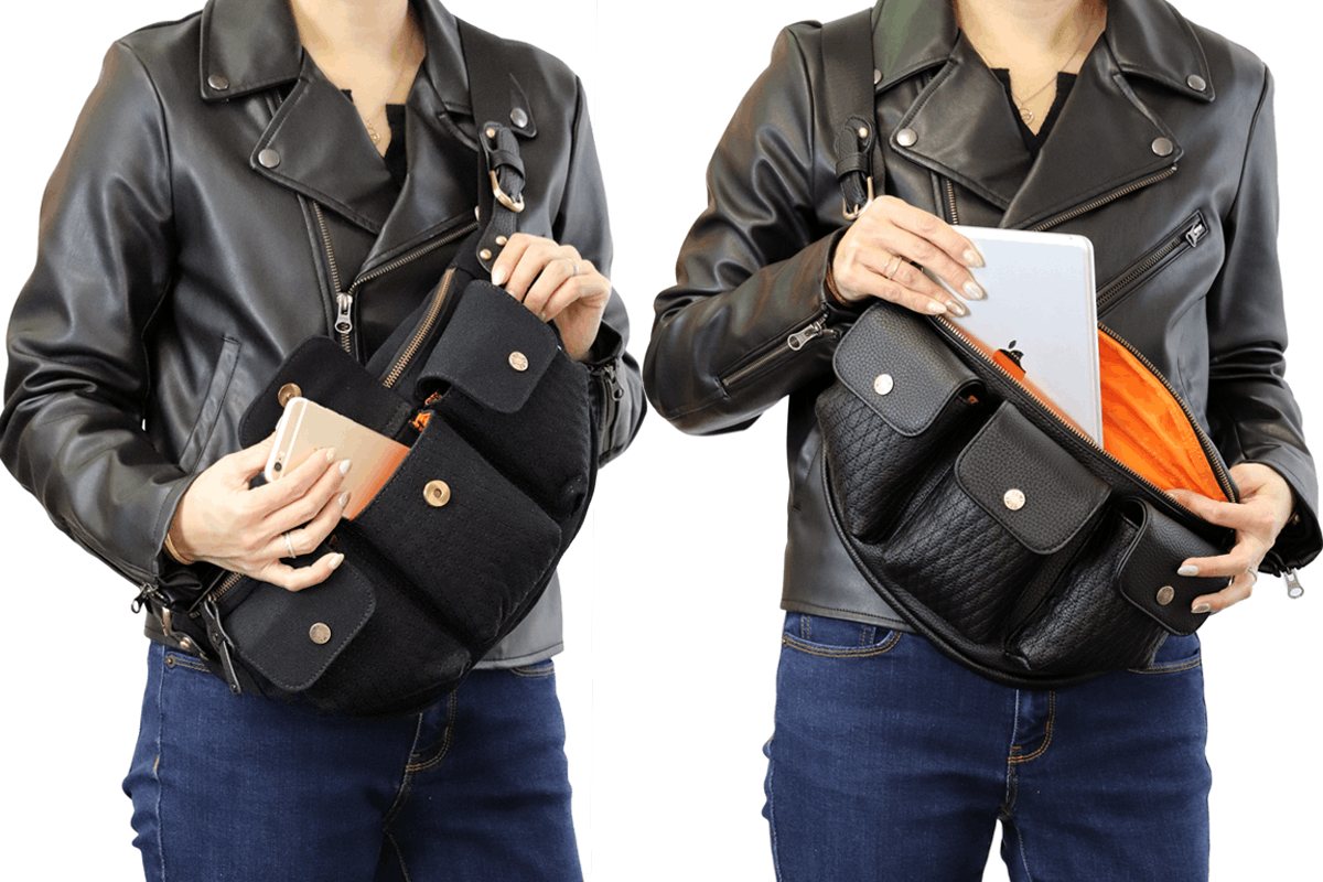 ・プロジェクトは、バイクにまたがっている時、街中を歩いている時、ペットとの散歩中でもスタイリッシュ&機能的で、よりカッコいいバッグを持ってもらいたいと思い、前面のポケット3個にダイヤステッチを施した、デザインに特徴のあるクロスボディバッグを考えました。