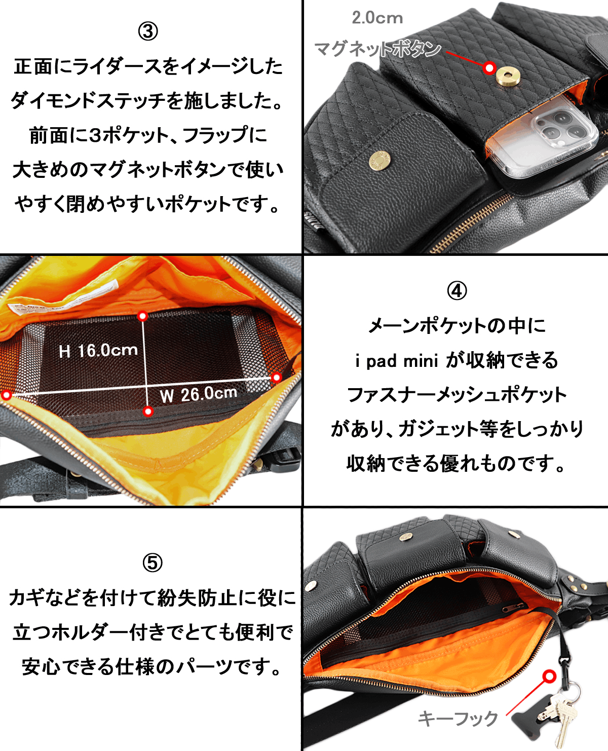 本革と違い、雨や水を弾きますのでツーリングなどに使いやすいショルダーバッグです。