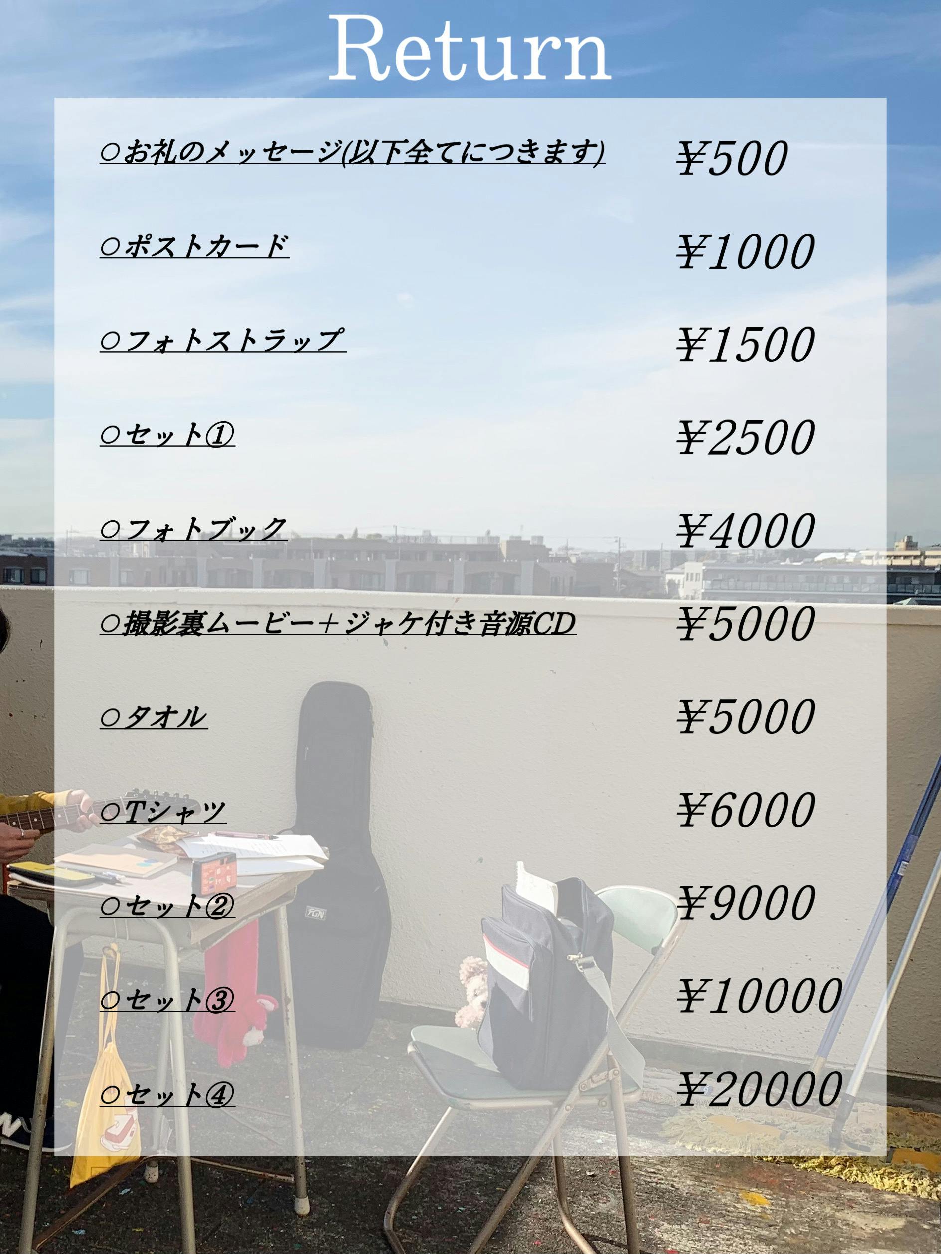 リターンには、Tシャツやタオル、フォトブック、CD等形のあるものを用意しているため、その制作費に充てます。