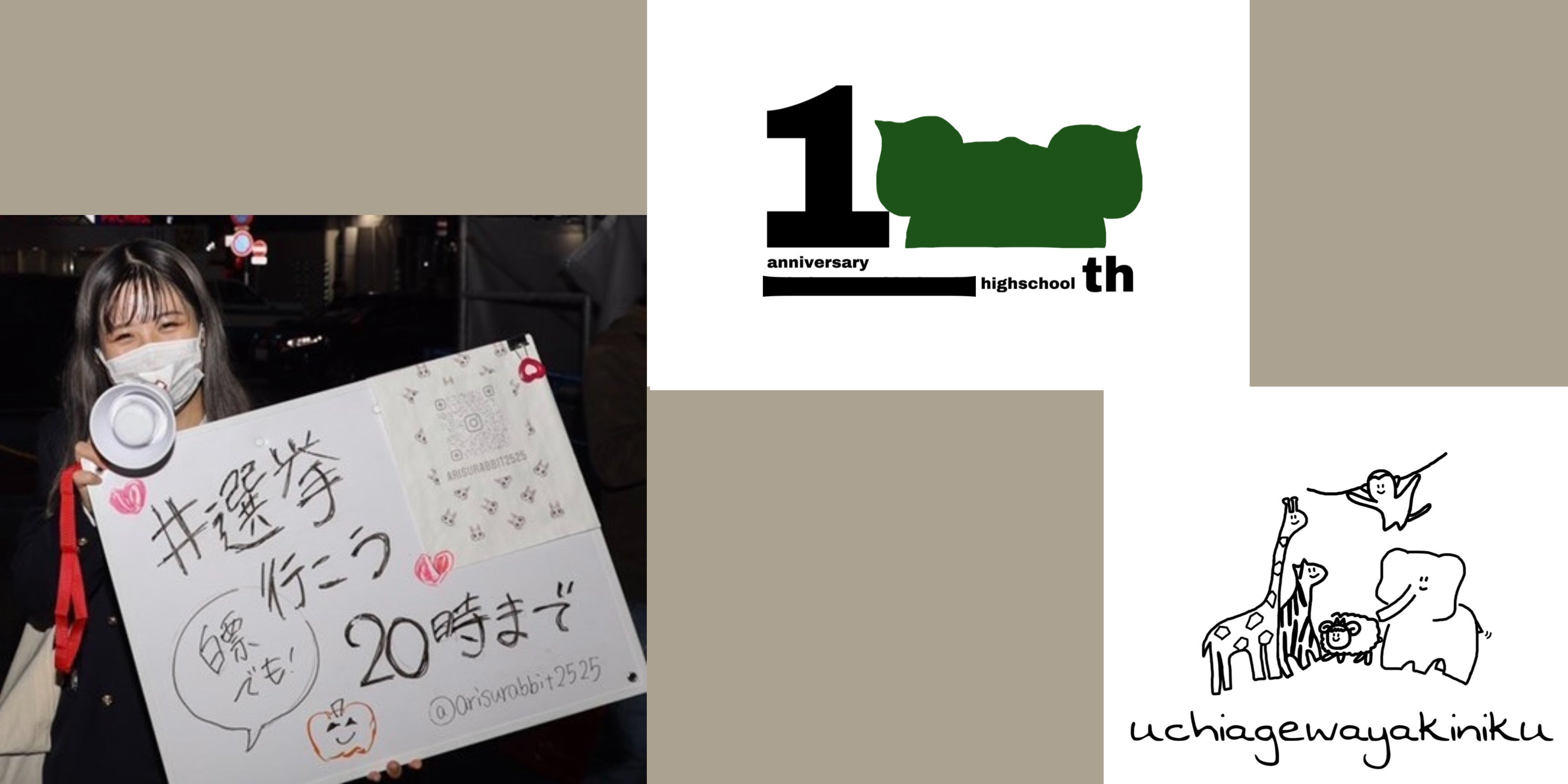 ※1枚目 自画像、証明写真/2枚目 選挙呼びかけ、100周年記念ロゴ案、クラスTシャツデザイン(企画:ジャングルクルーズ)