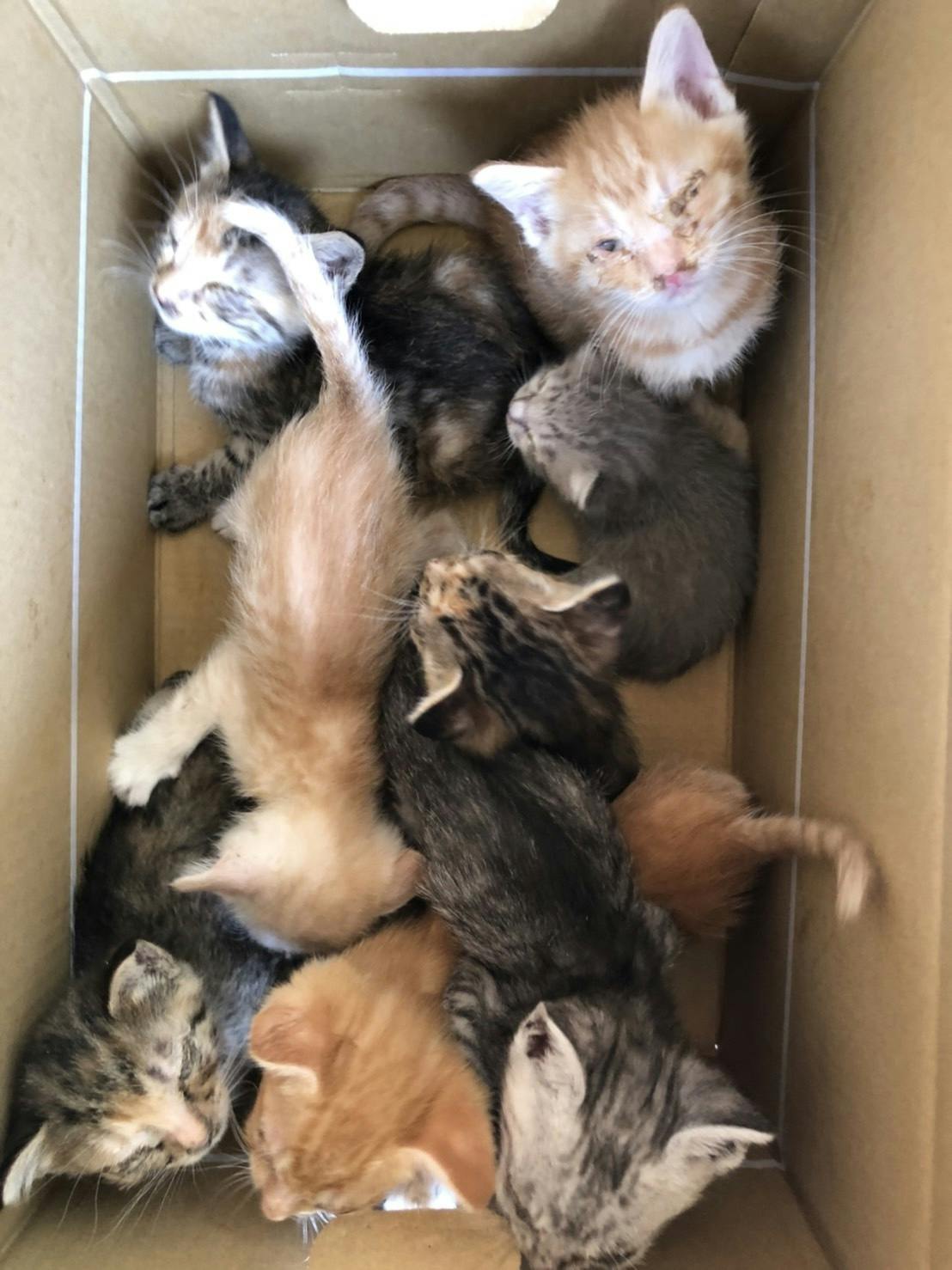 この写真は箱に入れられ、保護活動チームの家の前にいつの間にか置かれていた目も開かない幼齢猫です。この様な状態の仔猫が自ら箱に入って移動する訳はありません。残念ですが人が故意に置き去りにしていったとしか考えられません。人が占有した跡があれば明らかな遺棄=犯罪なのです。勿論、警察へも通報は済ませてあります。