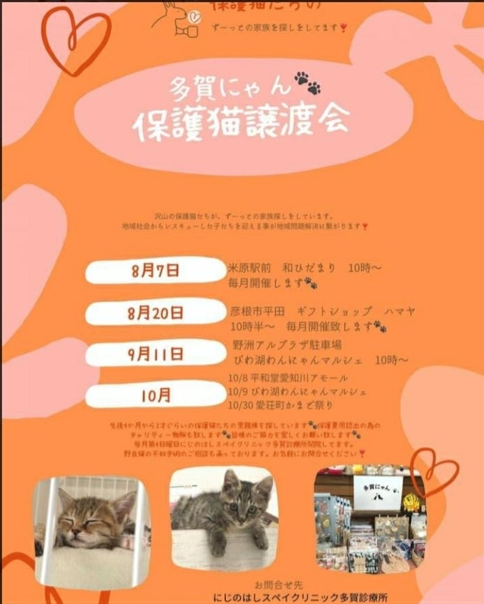 多賀にゃんとして単独の譲渡会やら、びわ湖わんにゃんマルシェ会場での譲渡会やら秋に向けて予定がびっしり。9月11日のマルシェでは啓発活動の一貫として会場に手術車両を設置して、手術の見学も可能とします。マルシェとしての新たな試みも計画中です。