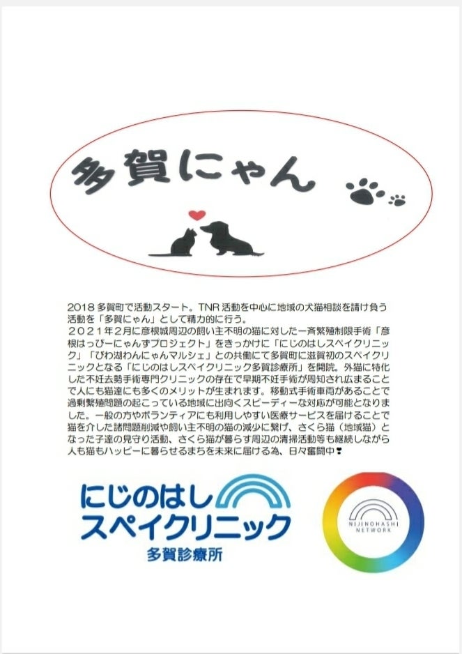 長らく活動報告が滞っており申し訳ございません。各自其々の活動でバタバタの日々は相変わらずの8月でした。月末の多賀診療所開院では二日間で41頭のハッピーにゃんずが新たな猫生を踏み出しました。開院以来一年で、合計で558頭のハッピーにゃんずを滋賀県各地に送ってきた事になります。しかしながらまだまだ私達に過剰繁殖の声は届きつづけています。そろそろ昨年の県動物行政の収容記録等が公表されるはずです。私達の活動は少しでも数字に現れているのだろうか?少しでも改善に繋がる活動とできたのか評価せねばなりません。