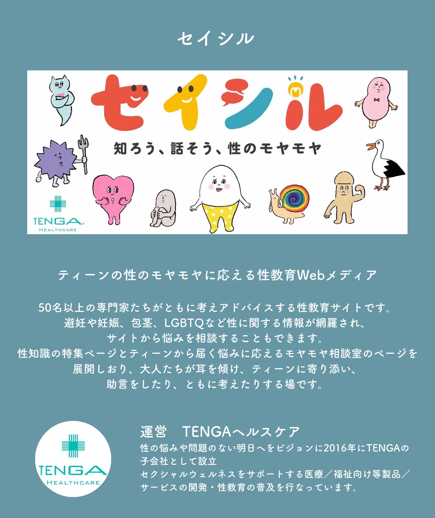 また、TENGAヘルスケアが運営する、ティーンの性のモヤモヤに応えるWebコンテンツ『セイシル』についてもご紹介していますので、チェックしてみてください。