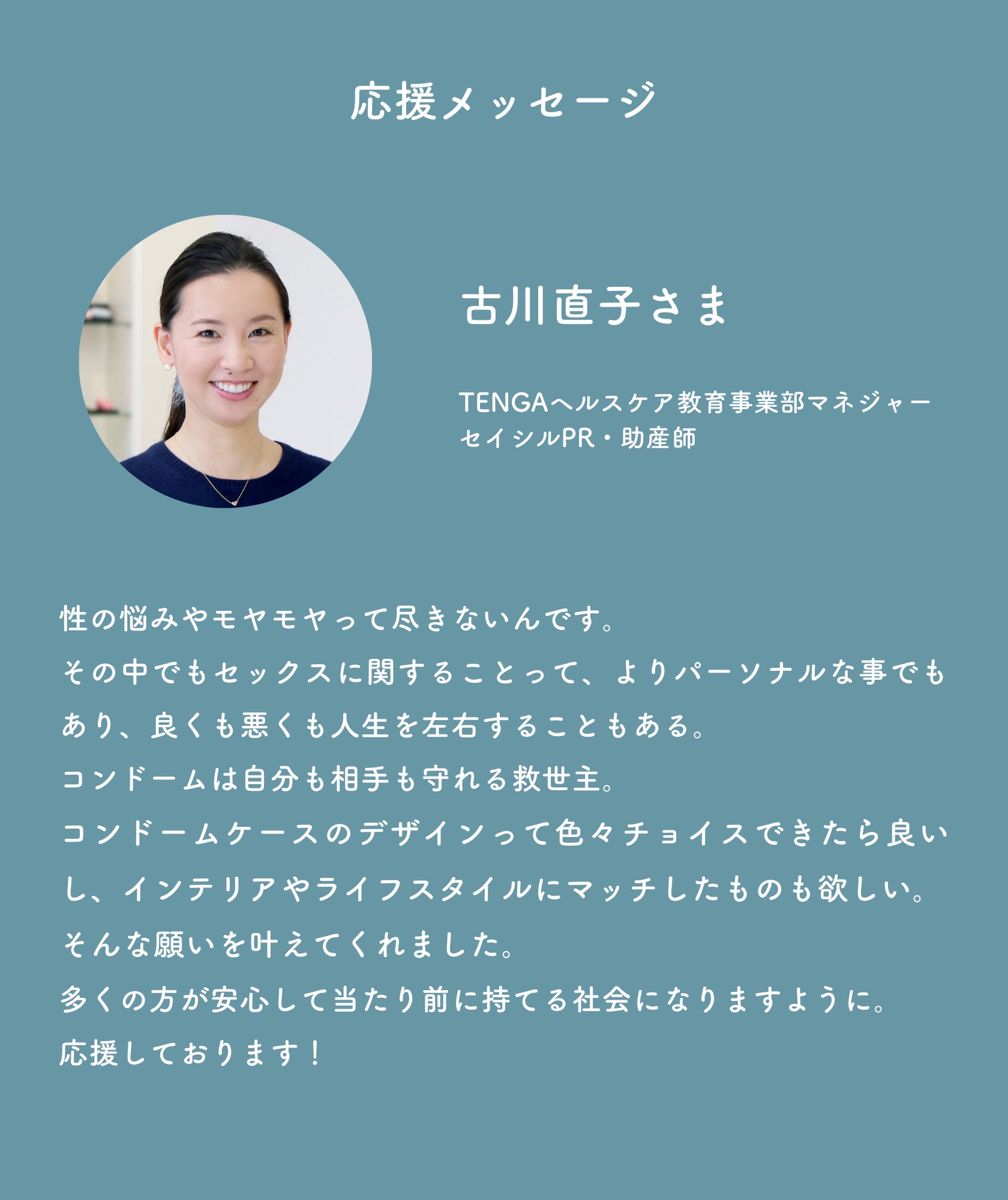 ネクストゴール発表にあたり、リターンのサンプルでお届けします『モイストケアジェル』を協賛でいただいております、TENGAヘルスケアの古川直子さまより、応援メッセージをいただいています。(画像をご覧ください)