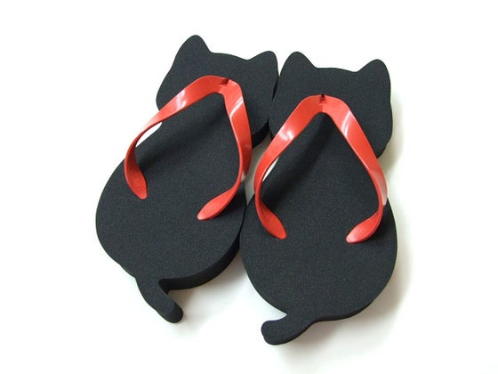 ネコTシャツと一緒に2018年の春夏に貴方のファッションコーディネイトをキュートにしてくれる 「ネコ履き」を追加いたしました♪ 黒猫とトラ猫、どちらも可愛いです♪ サイズ/フリー ◎サイズの目安◎詳しくは画像をご覧くださいませ。レディースの場合 23cm〜メンズの場合 〜25.5cm 【サイズ感/着用編】●23cm(女性)のスタッフが履いてみました。かかとは1.5cm余っていますが問題ありません。 鼻緒に余裕があります。 ●25.5cm(男性)のスタッフが履いてみました。かかとは1cm出ますが、しっぽに乗るので問題ありませんでした。 鼻緒も丁度良い感じです。 【素材】 ビーチサンダル素材です。 独立気泡発泡スポンジ製なので、水が染込まずクッション性を確保しています。 鼻緒はソフトな樹脂製で、足にフィットしやすい柔軟性があります。滑りにくい凸凹加工です。