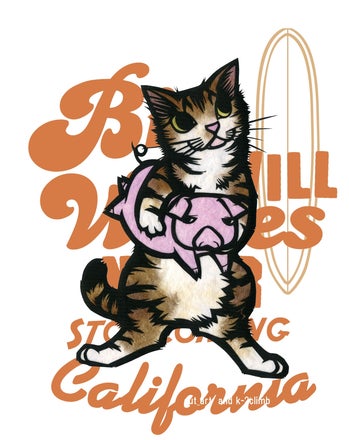 フロントに大きくプリントされる予定の豚(沖縄の豚アグー)を抱いた猫さん ブタさんを抱いて波乗り予定です!! ※イメージ※ 引き続き、他のTシャツのデザインも作っていきます!