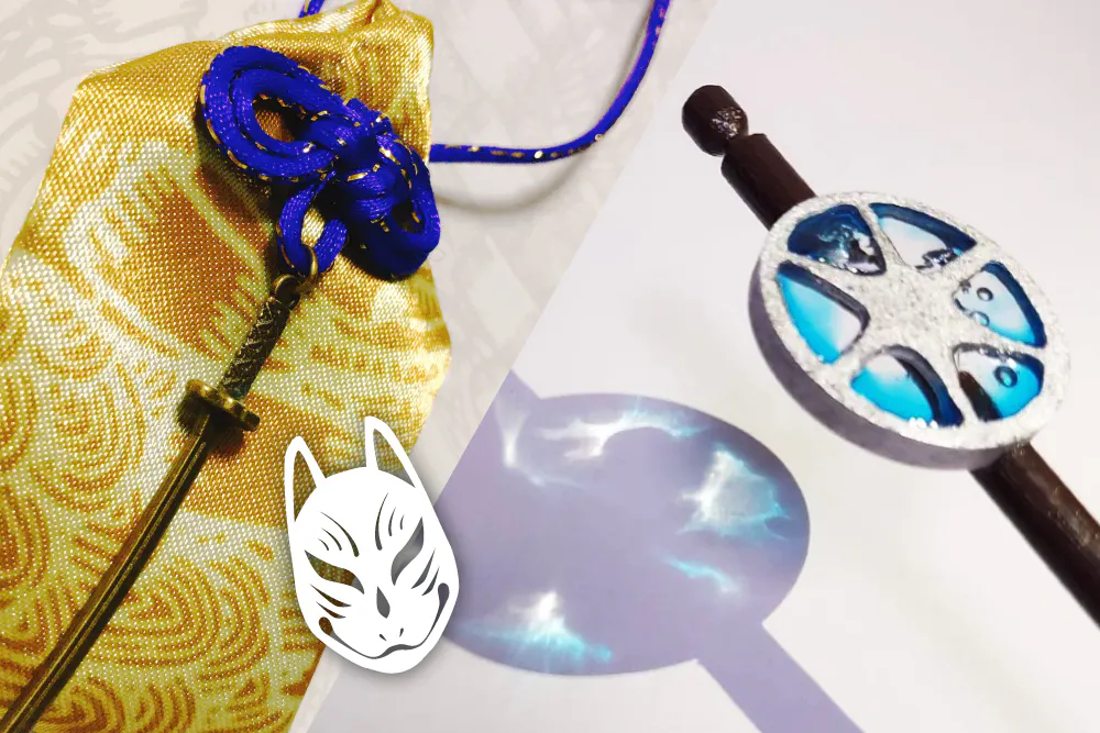 香袋の中のお香はマリン系とボタニカルの爽やかな香りの組み合わせ。袋に付くチャームは、物語のキーとなる足型または狐面のどちらかを先着順でお選びいただけます。
