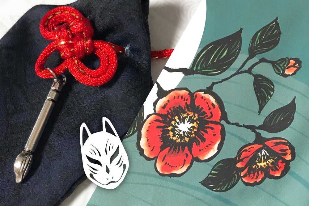 香袋の中のお香はマリン系とボタニカルの爽やかな香りの組み合わせ。袋に付くチャームは、物語のキーとなる足型または狐面のどちらかを先着順でお選びいただけます。
