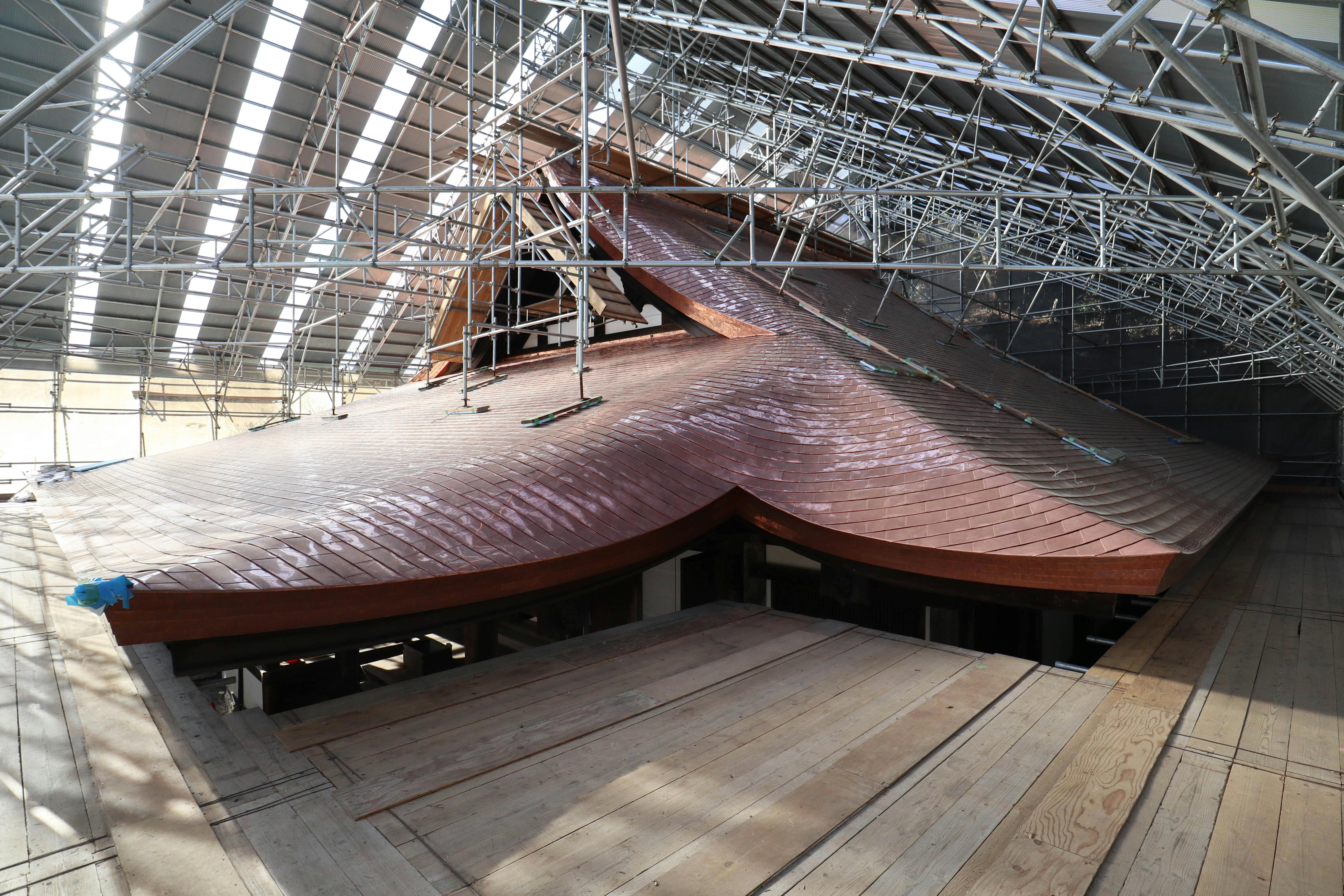 現在、本堂屋根の銅板も葺き終わり覆い屋も撤去を行って工事も概ね完了をしました。