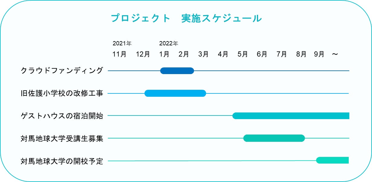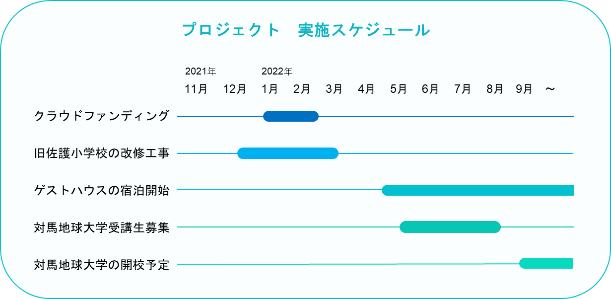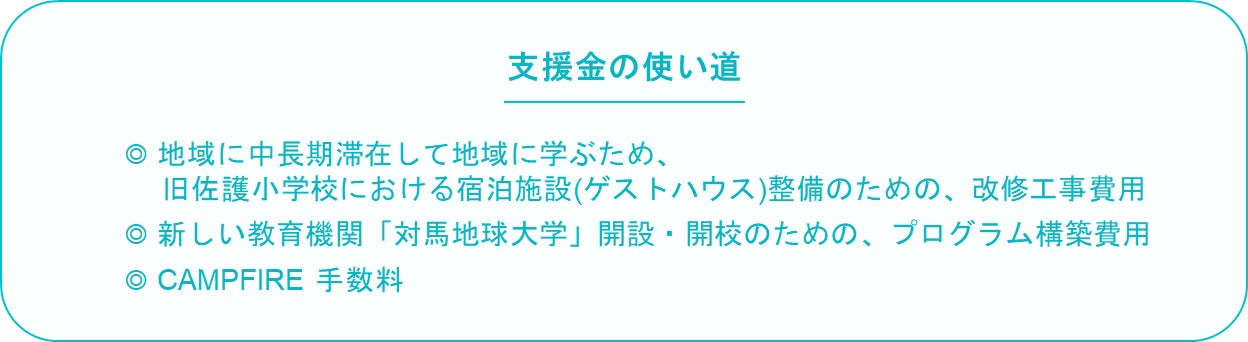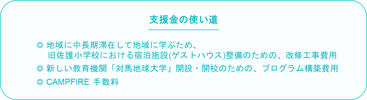 昨年度から、長崎県と対馬市が連携する、まちづくりのモデル構築に向けた補助事業を活用し、加えて金融機関からの融資を受けておりますが、それでも大きな初期費用がかかるため、数千万円の自己資金が必要です。今回のクラウドファンディングの支援金は、校舎改修というハード面と、「対馬地球大学」の教育プログラム構築というソフト面の、両方に充てさせていただきます。