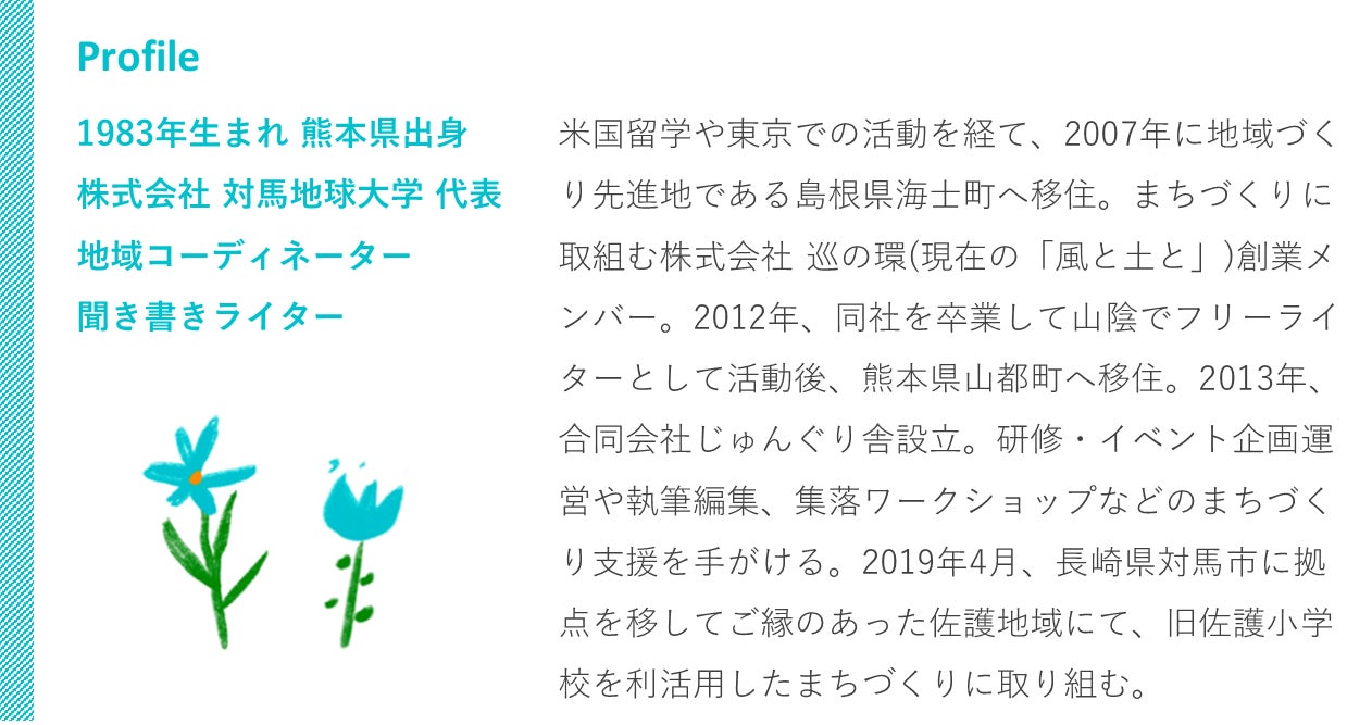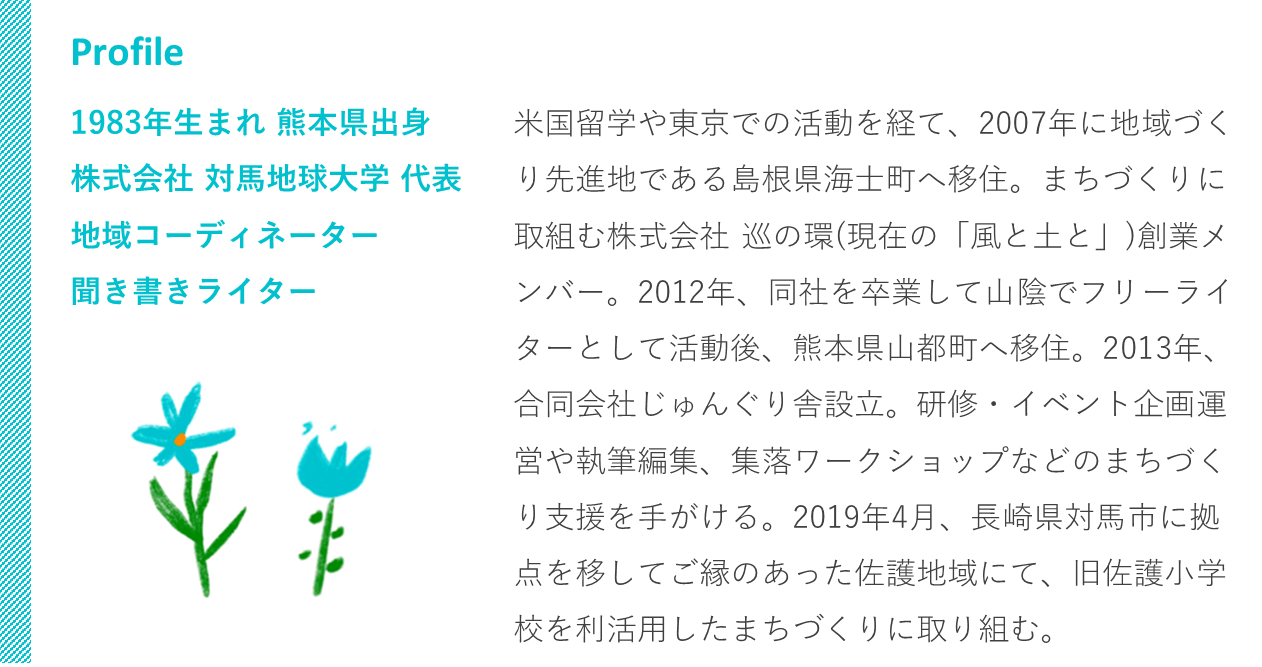 私のライフワークは、微力ながら、地域コーディネーターとして、地域に豊かにあるチカラ・魅力を引き出させていただき、活かさせていただくことです。2007年冬から、島根県・隠岐諸島の海士町(あまちょう)や、熊本県・阿蘇山麓の山都町(やまとちょう)での活動を経て、2019年春に長崎県の離島、対馬へ。この丸14年間、ずっと「地域まるごと、地域に学ぶ、学び舎を創りたい!」という夢を抱いてきました。現在も海士、山都、対馬の皆さんにお世話になり、日々学ばせていただいています。