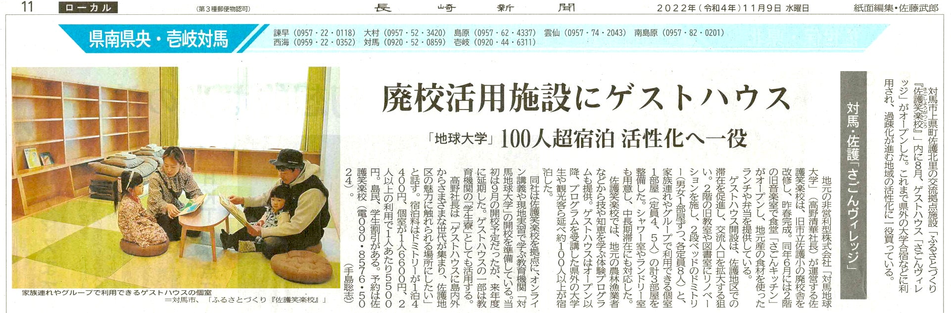 2022/11/16 08:0011/9付の長崎新聞さんローカル面に今年オープンしたゲストハウスについて記事をご掲載いただきました。ありがとうございます!素敵なファミリーが写っている写真の個室は、0歳のお子様からもお泊まりいただけます♪ワーケーション等でのご利用も大歓迎です!!学校に泊まる非日常を味わいに、ぜひお越しください〜!※下記でオンライン記事をご覧いただけますhttps://nordot.app/964338935007035392◆対馬地球大学Web(リニューアルしました!)https://tsushima-gaia-univ.jp/ もっと見る