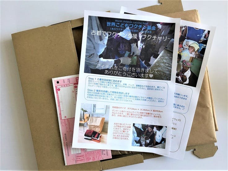 専用の回収袋と宅急便の伝票が同梱されています。ご自宅でお申し込みから発送まで、送料をお支払い頂くことなく、古着を簡単に片づけられます。アイテムが換金された金額に加えて、回収キットひとつご購入でDTPワクチン15人分にあたる300円の団体運営費の補助になります。