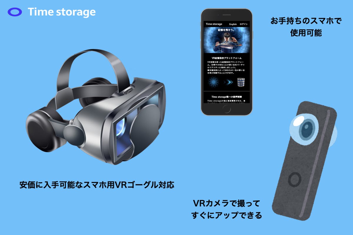 またVRカメラがなくても、おすすめVR動画も用意しておりますので、2,000円〜4,000円ほどで購入できるスマホ用VRゴーグルさえあれば、Time storageをお試しいただくことができます。