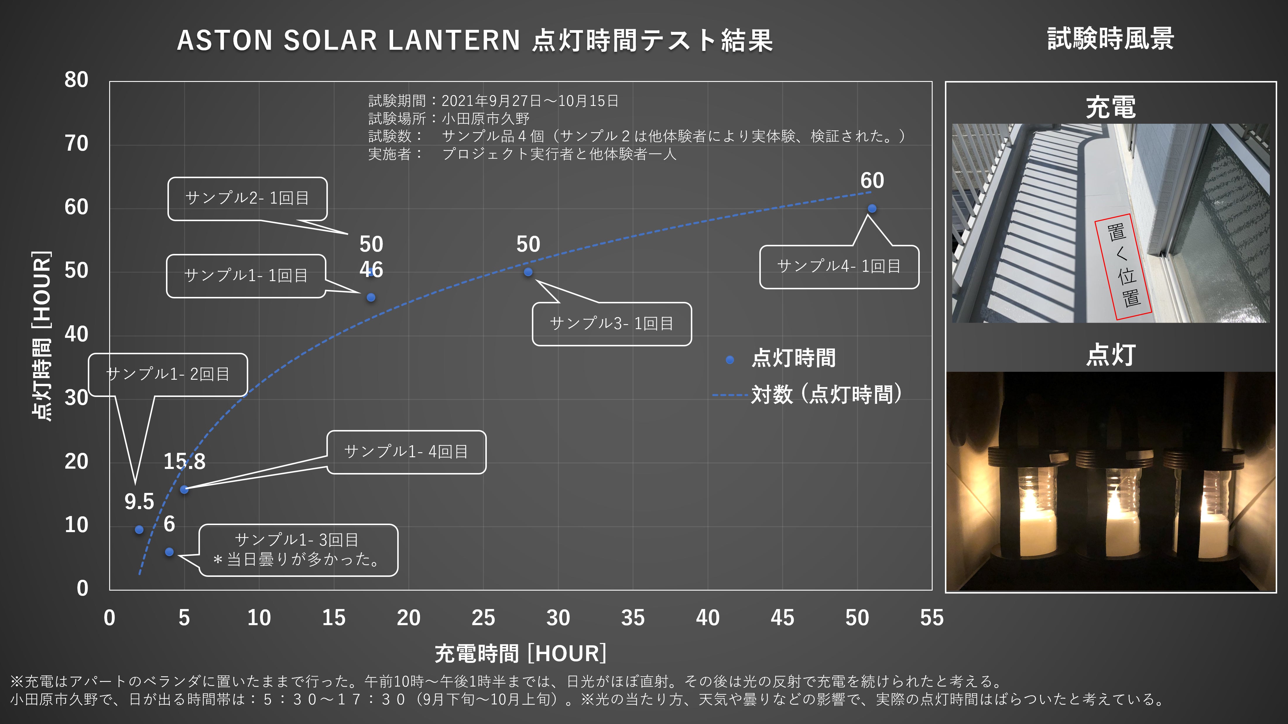A6 製品規格ではなく、あくまでも体験者の実験ですが、最大約60時間点灯できています。天気や光の当たり方により、充電と点灯時間は変わりますのでご参考としていただければと思います。