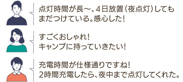 点灯時間、充電速度、デザイン性に共感をいただきました!