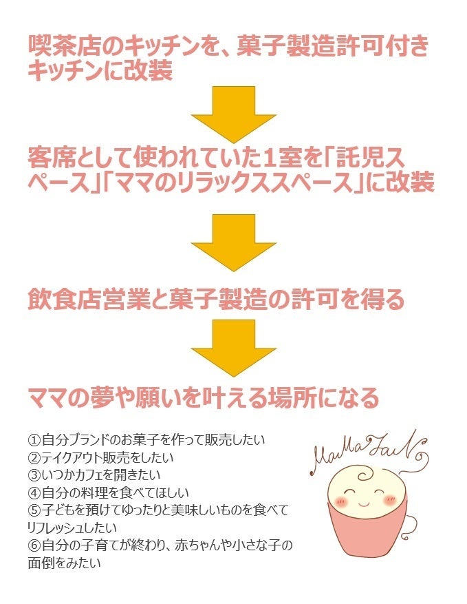 そしていろいろなママがやりたいことを実現させる場所としても機能させていくために、単なるレンタルスペースから菓子製造許可付きキッチン&カフェを開きます。