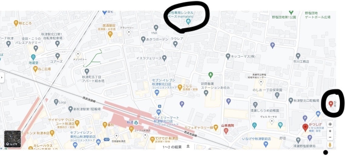 いなげや秋津駅前店さんの近くです(上の黒丸が現mamatano、右端が新店舗の場所です)。