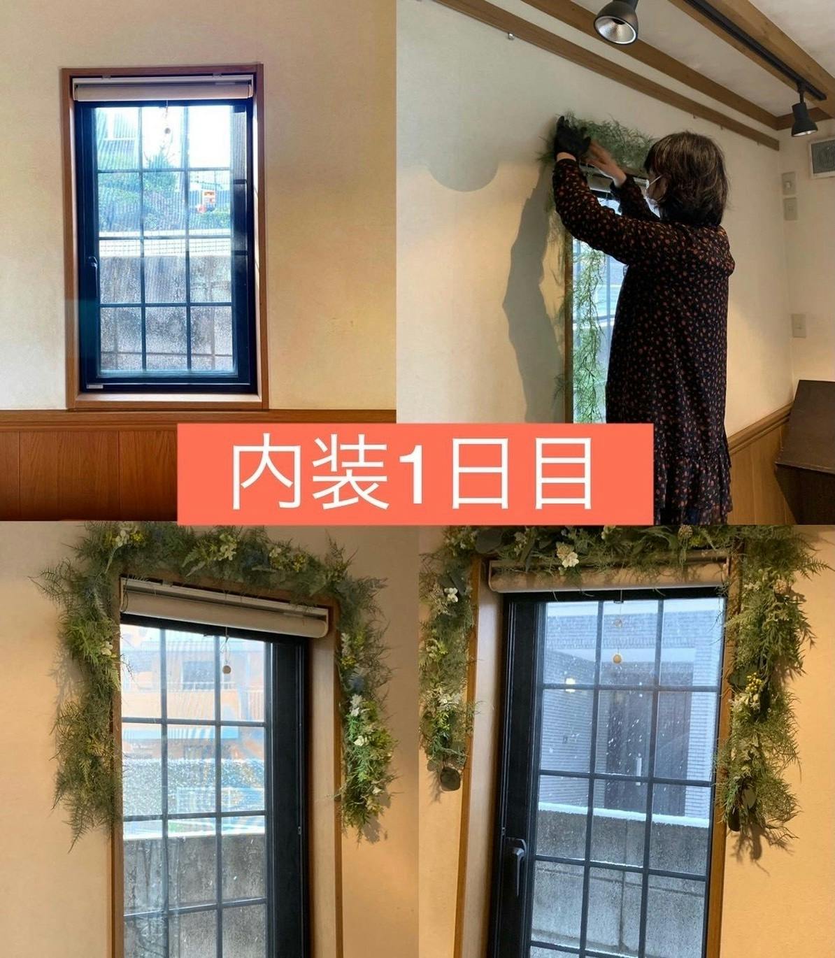 雪のため、作業は途中で終えましたが、シンプルな窓枠はガーランドで素敵に飾られました。