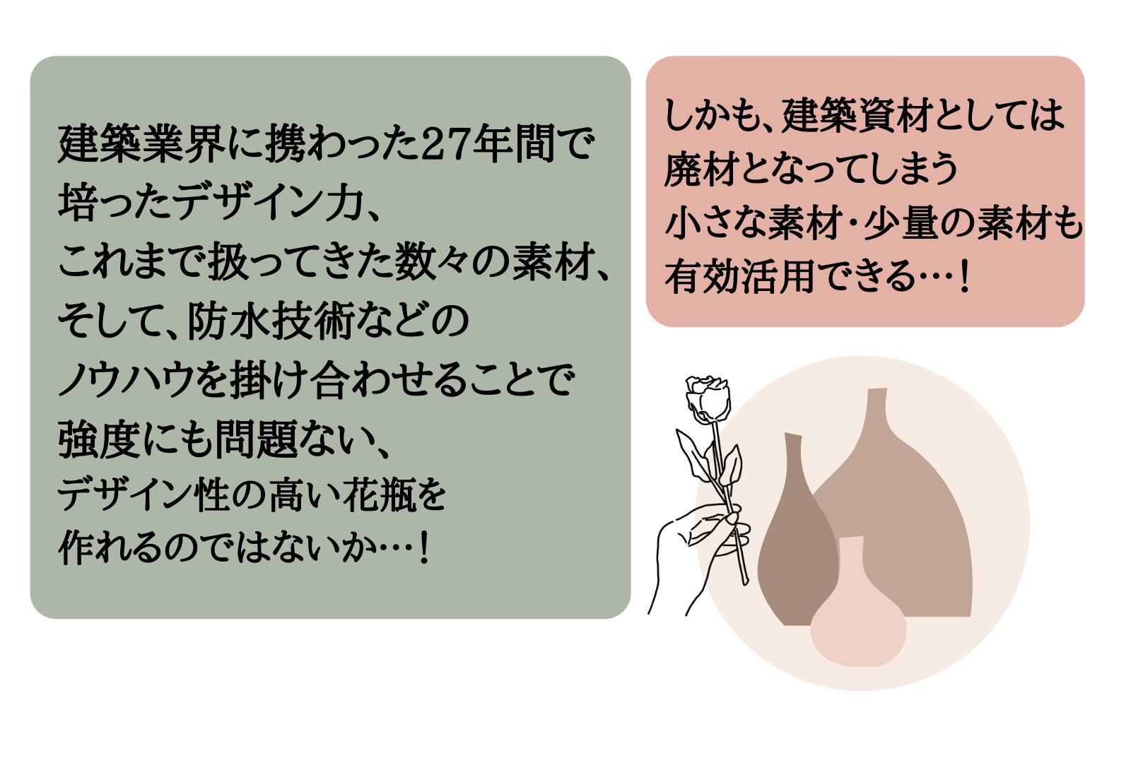 長年の経験で培ったノウハウを生かし、建築資材を使った花瓶を製作し始めて、5年になります。