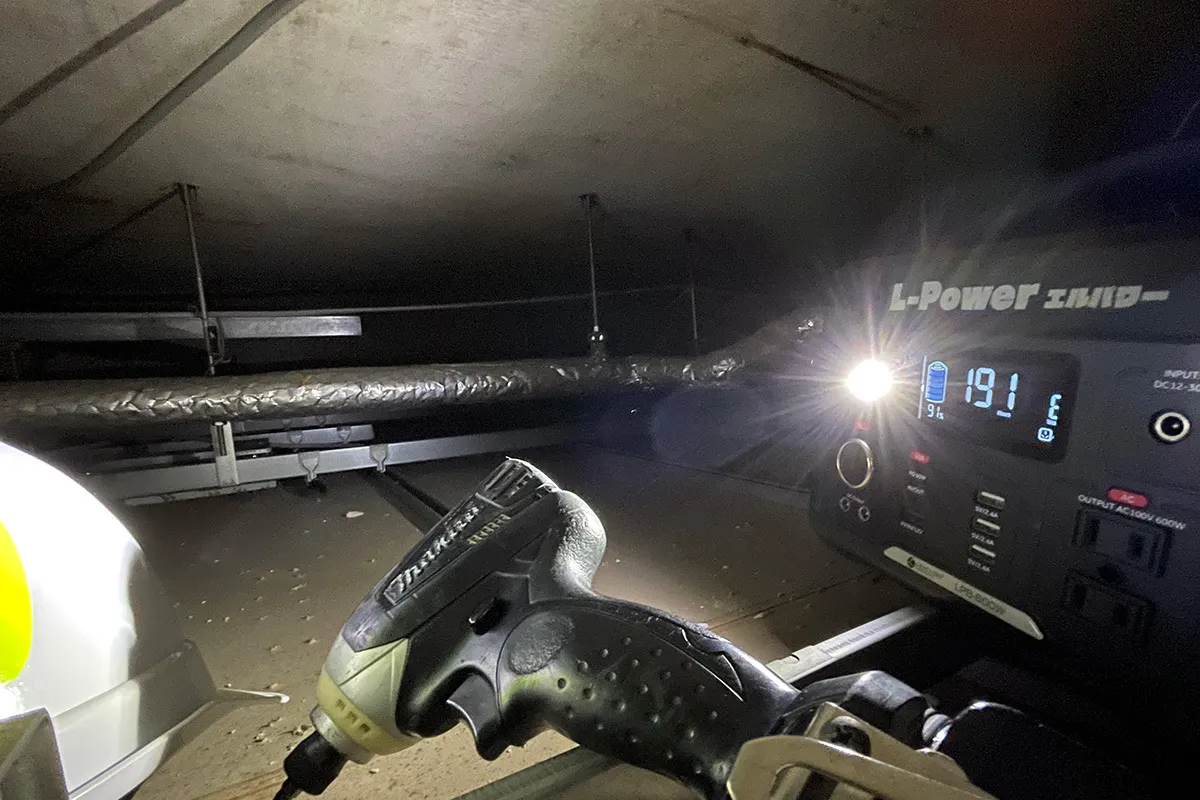 天井裏の作業、手元も真っ暗。脚立にドラムおいて照明を点灯。うーん煩わしい…