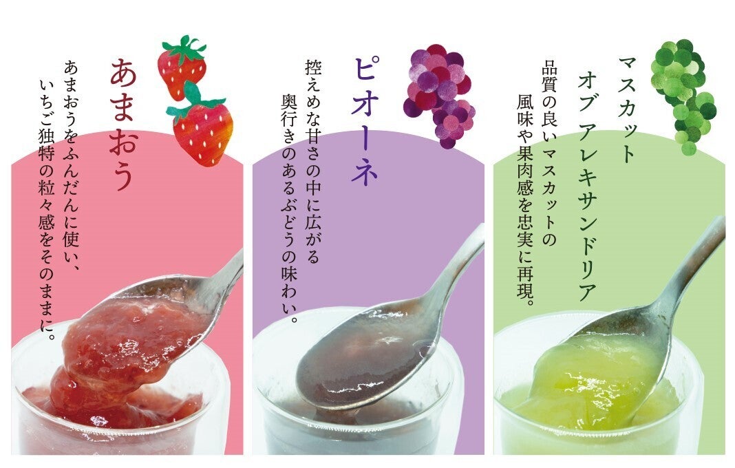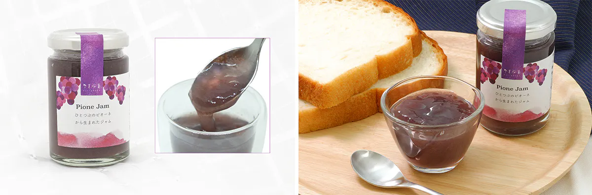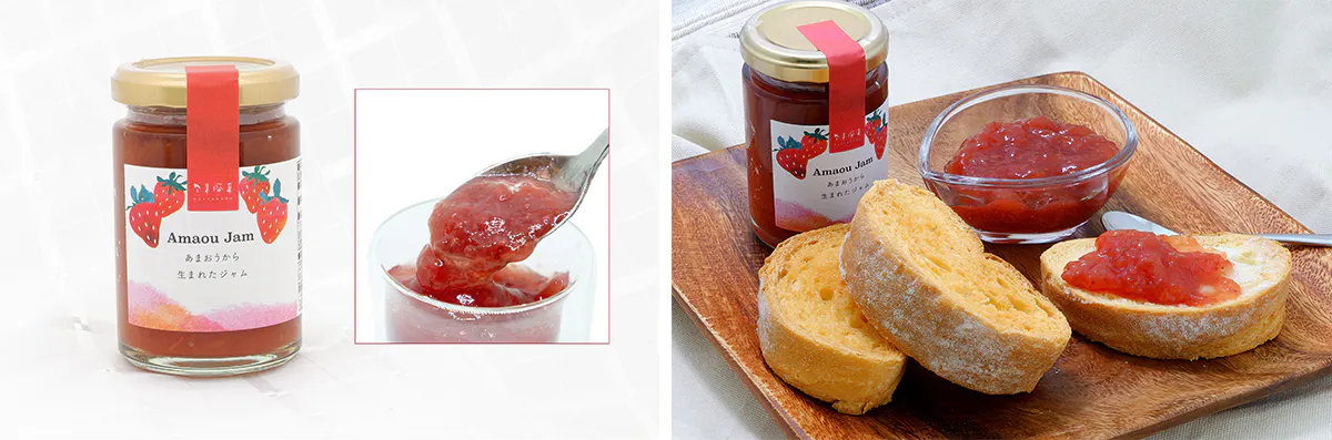 そんな状況の中で誕生したアイテムの一つが、「マスカットジャム」・「ピオーネジャム」・「あまおうジャム」です。もとより高品質な素材を使用して、原料の有効活用に取り組んでジャムづくりを進めてきました。ジャム自体がメインの商品というわけではないものの、人気商品から派生した、いわゆるスピンオフ的な商品ということで、派生元商品との組み合わせ販売でもご好評をいただいておりました。