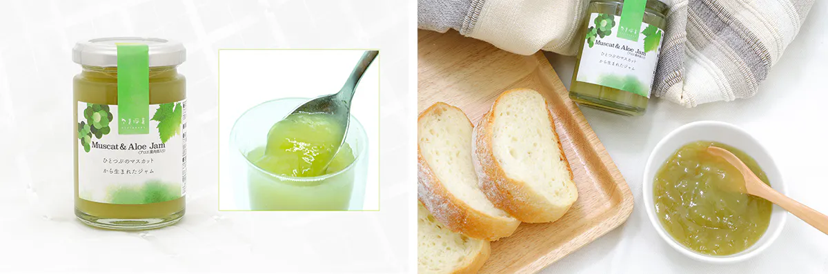 【マスカットジャム】果実等(ぶどう(岡山県)、アロエベラ葉肉部)、砂糖/増粘多糖類、酸味料、着色料(紅花黄、クチナシ)、酸化防止剤(V.C)