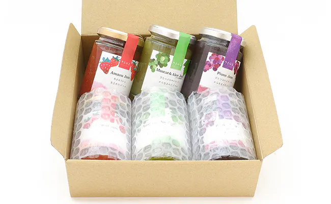 申し訳ございませんが、お届けは「輸送用の簡易的なパッケージ」です。クラフト紙のような素材の箱に緩衝材に巻いたジャムを並べて詰めている状態です。