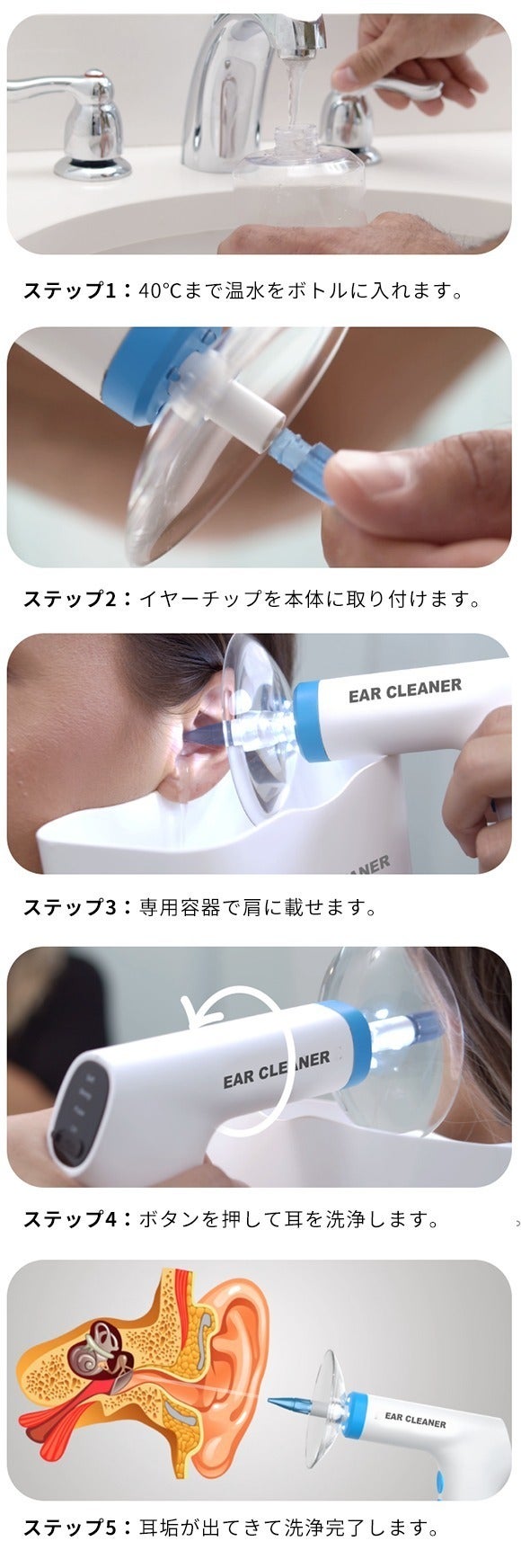 1.柔らかい水圧で耳穴をキレイに掃除!