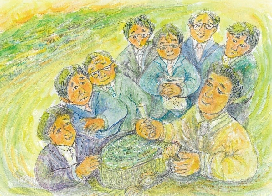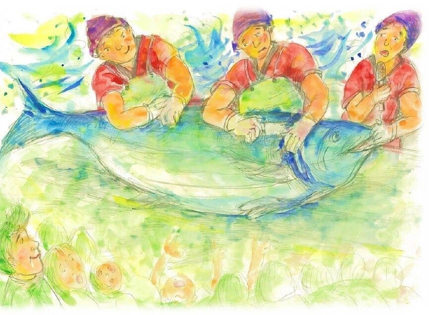 「伊達マグロ」の解体実演販売に取り組む宇和島水産高等学校の生徒が、郷土の期待を背負い、販売の新しい形を創造し、全国・世界へと羽ばたいていった取組をモチーフとしています。これは、こどもたちに 新しいことへ挑戦することを考えてもらうためのお話です。