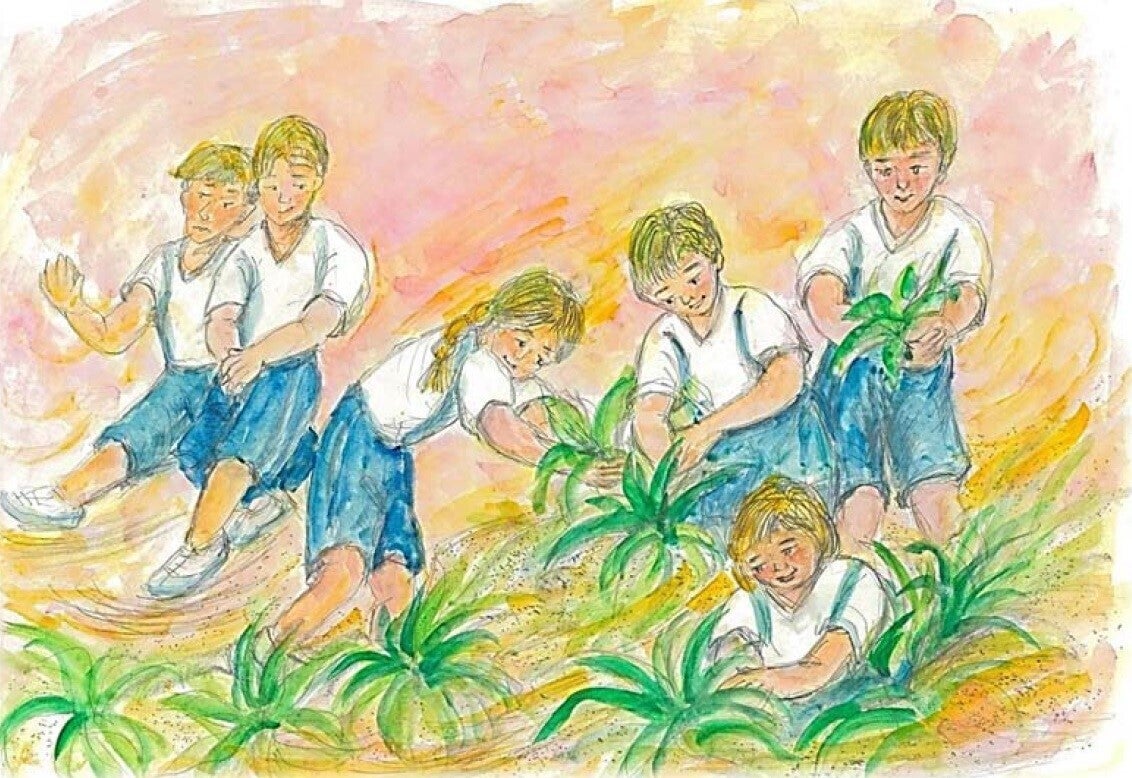 宇和海に浮かぶ沖の島の植物ハマユウが絶滅の危機に瀕しました。これを受け、旧宇和海中学校の生徒たちが保護活動を始めました。この保護活動は、現在も城南中学校生徒会に引き継がれています。これは、こどもたちに受け継ぐことの大切さを考えてもらうためのお話です。