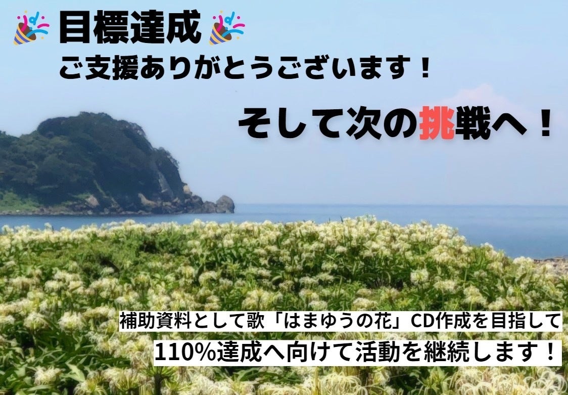 当初の目標金額は書籍編集・発行と音読CDを録音・配布するために必要最低限の金額として設定しておりました。今回の皆様のご支援を受けて、宇和島出身の歌手・声優である中川奈美さんより、「はまゆうの花」の歌の収録CDの制作のお話をいただきました。