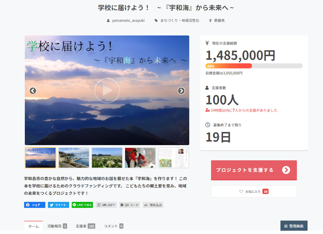 本日、支援者数が100人となりました。宇和島の皆様方をはじめ、多くの方々のご声援が励みになり、目標金額も約50%を達成することができました。