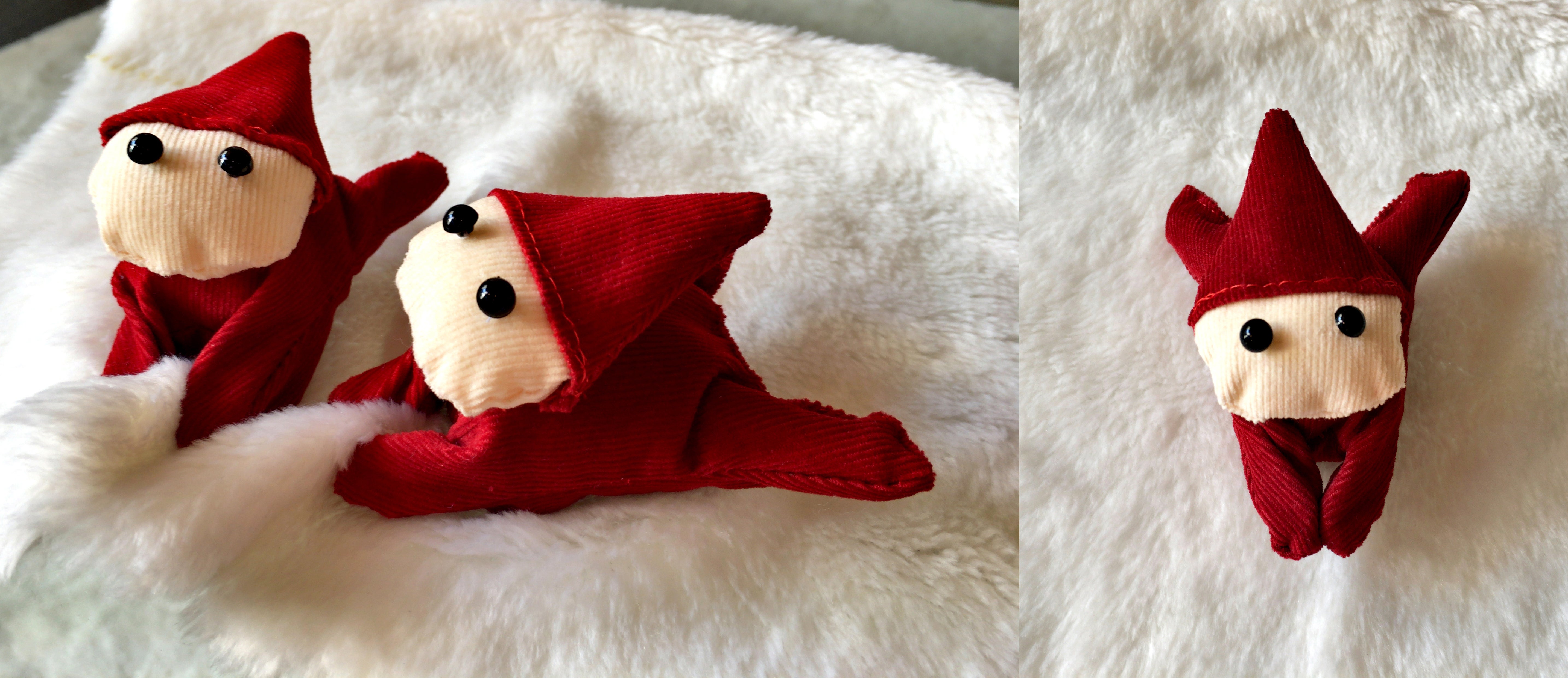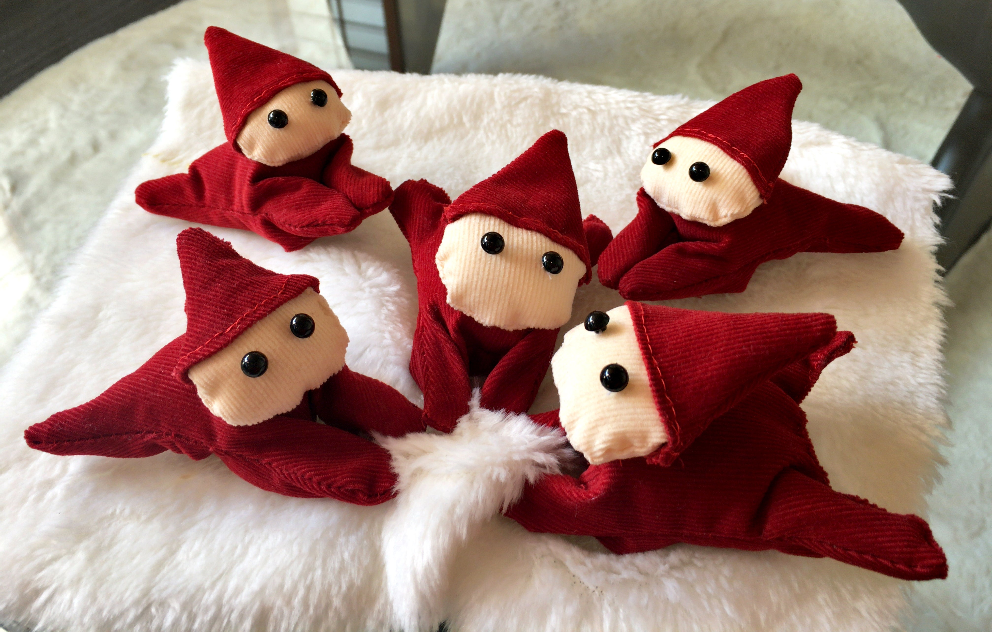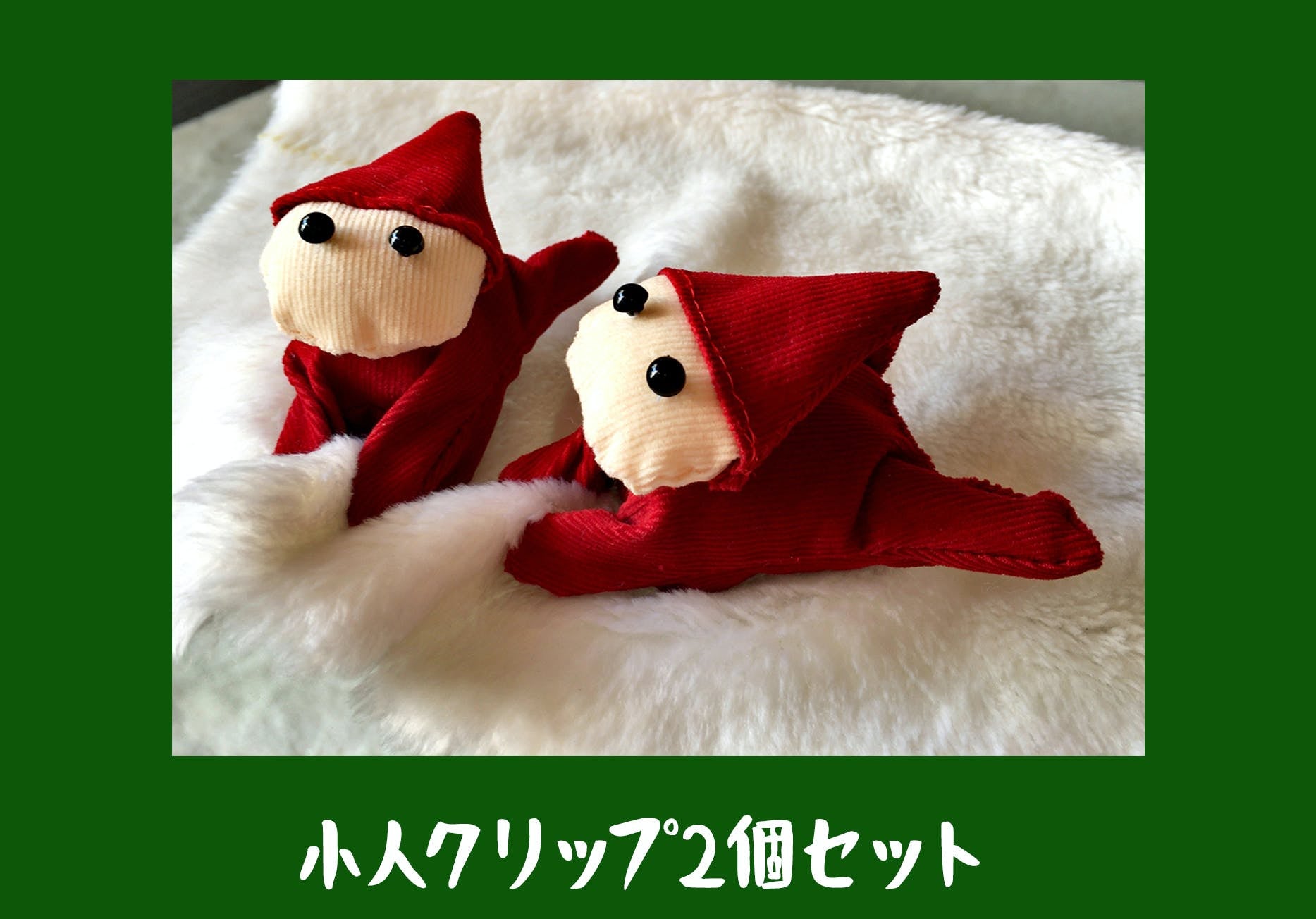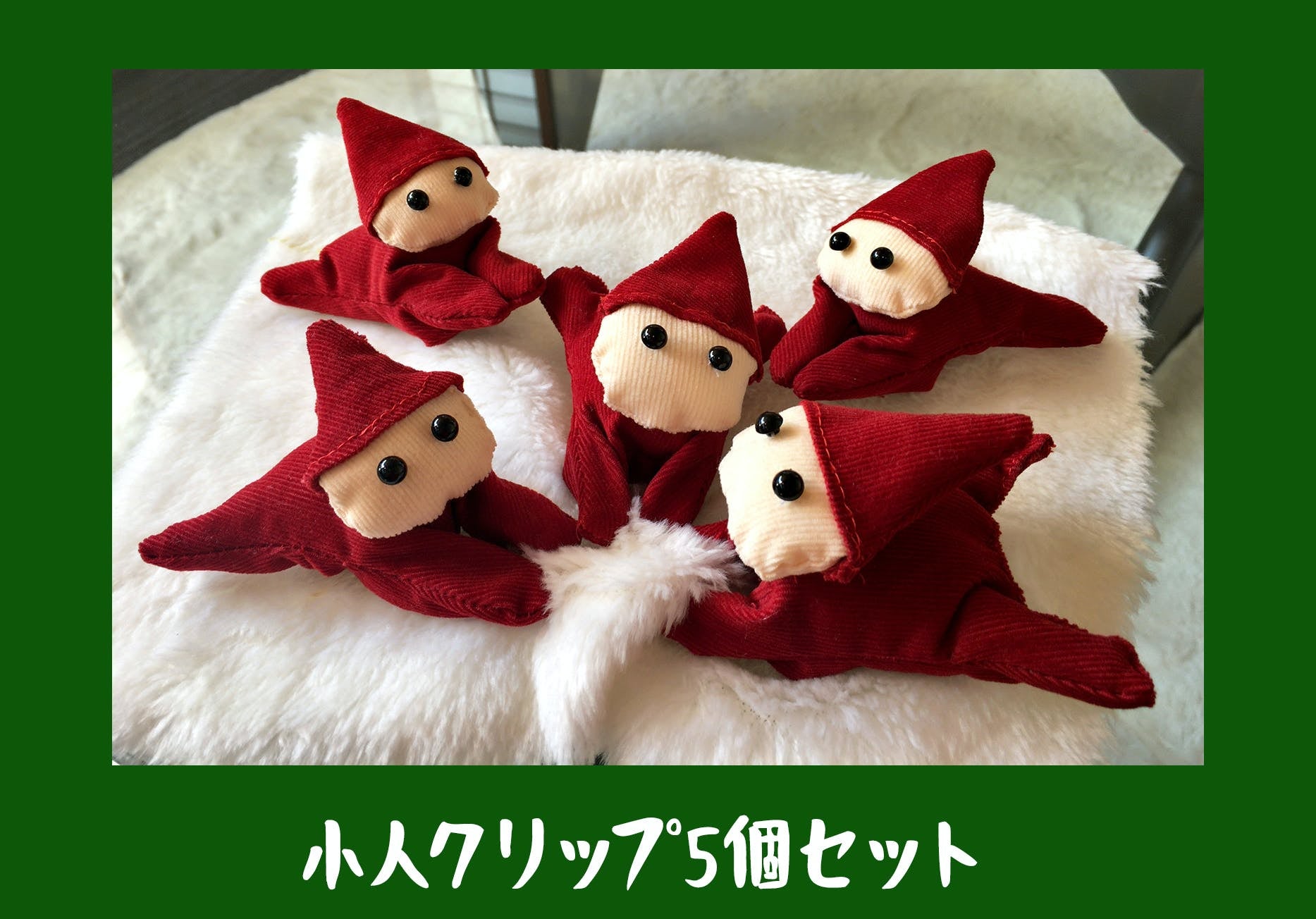 洗濯ばさみをぬいぐるみのように覆い、かわいいインテリア雑貨に生まれ変わりました。小人がたくさんぶら下がっているようなクリスマス飾りやカーテン止めなどにどうぞ。(サイズ10㎝程)
