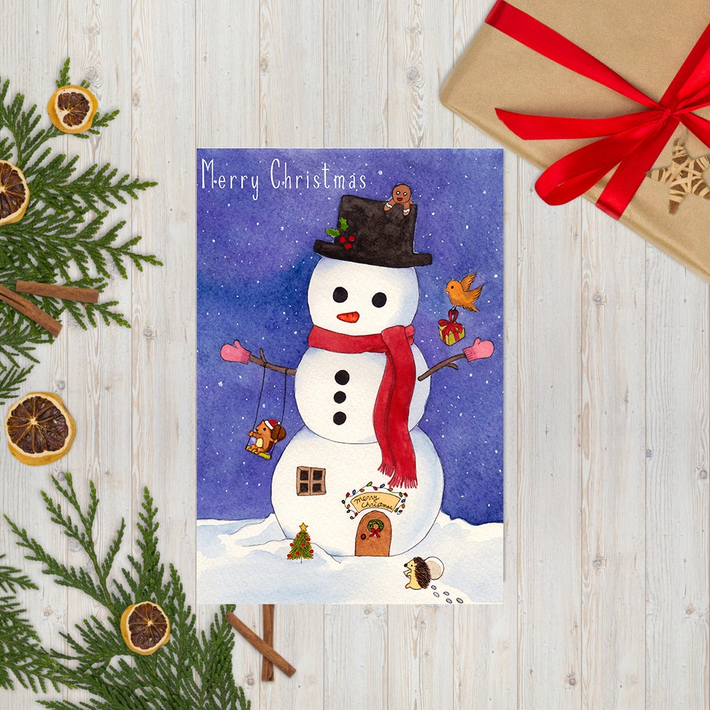 大きな雪だるまの家に小さな動物たちが集まってくるイラストのポストカード5枚セットです。(はがきサイズ)友人に送るクリスマスカードに使って下さい。