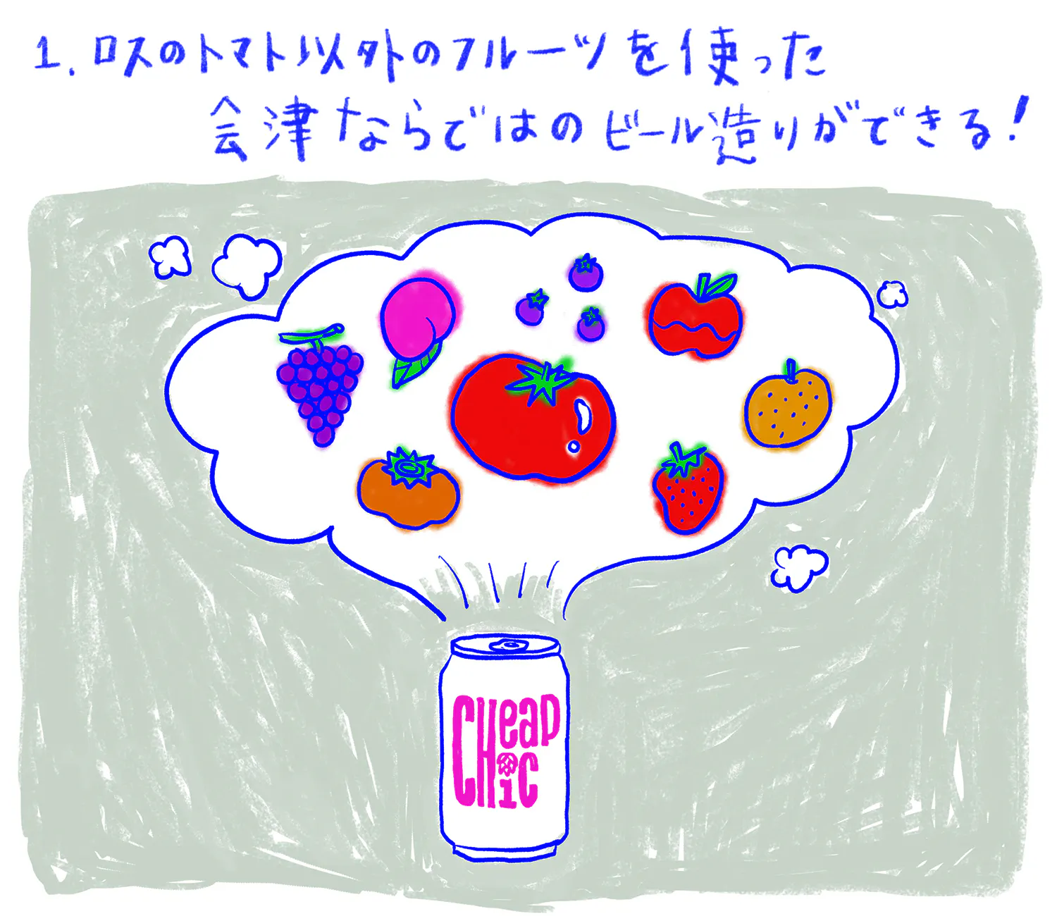 冷涼な気候は様々な農作物に適していて、会津はりんごや梨などフルーツの生産も盛んな場所です。フルーツもトマトと同様にロスの多い農作物の一つ。虫食いや形の悪いもの、完熟を過ぎて落ちてしまったものなどまだまだ美味しく食べられるフルーツが廃棄されています。そんなトマトやフルーツを使ってこの場所ならではのビール造り、具体的には華やかな酸味が特徴的なサワービールや、少し濁りのあるヘイジービールなど、近年クラフトビール界で注目されている新しいビールが会津で造れると思っています!