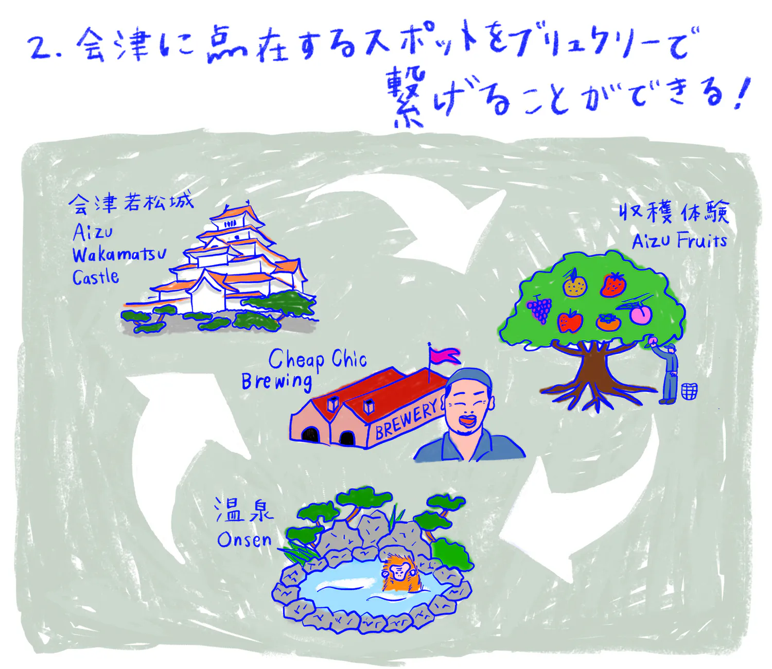 会津は会津温泉や伝統工芸、農業体験施設など様々な魅力的なスポットが集まっています。しかし現状はそれらを繋ぐ存在がなく、それぞれが孤立して点在している状況。バーやボトルショップを併設したブリュワリーを作ることで、例えば農業体験をした農家さんのリンゴを使ったビールが作られている、そのビールが温泉でお風呂上がりにまた宿泊先の宿で楽しめる、ブリュワリーの見学からフルーツやホップの畑の見学に参加できる、など会津のハブのような存在になりたいと思っています。