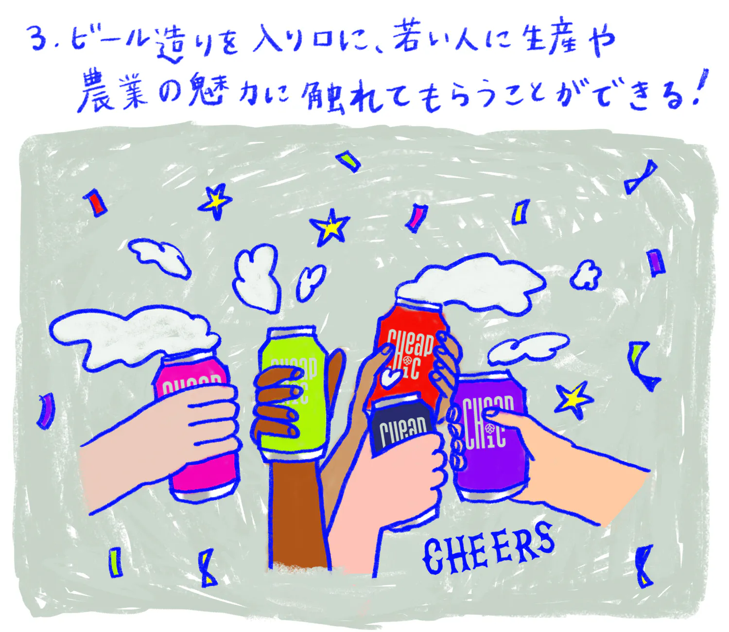 クラフトビールが話題になってからしばらく、今ではIPAやペールエール、スタウトやサワービールなど様々な種類のビールが認知され、その味わいの幅広さを多くの人が自由に楽しめるようになりました。同時に国内にもマイクロブリュワリーと呼ばれる小さなブリュワリーが増え、ビール造りのシーンも盛り上がっています。若い志を持った人がビール造りのために都心を離れて地方に移住するというケースも珍しくありません。農業や生産に近いビール造りの現場を見たり体験するだけでも、ものづくりの楽しさや農業の魅力に触れてもらえる大きなきっかけになると思っています。