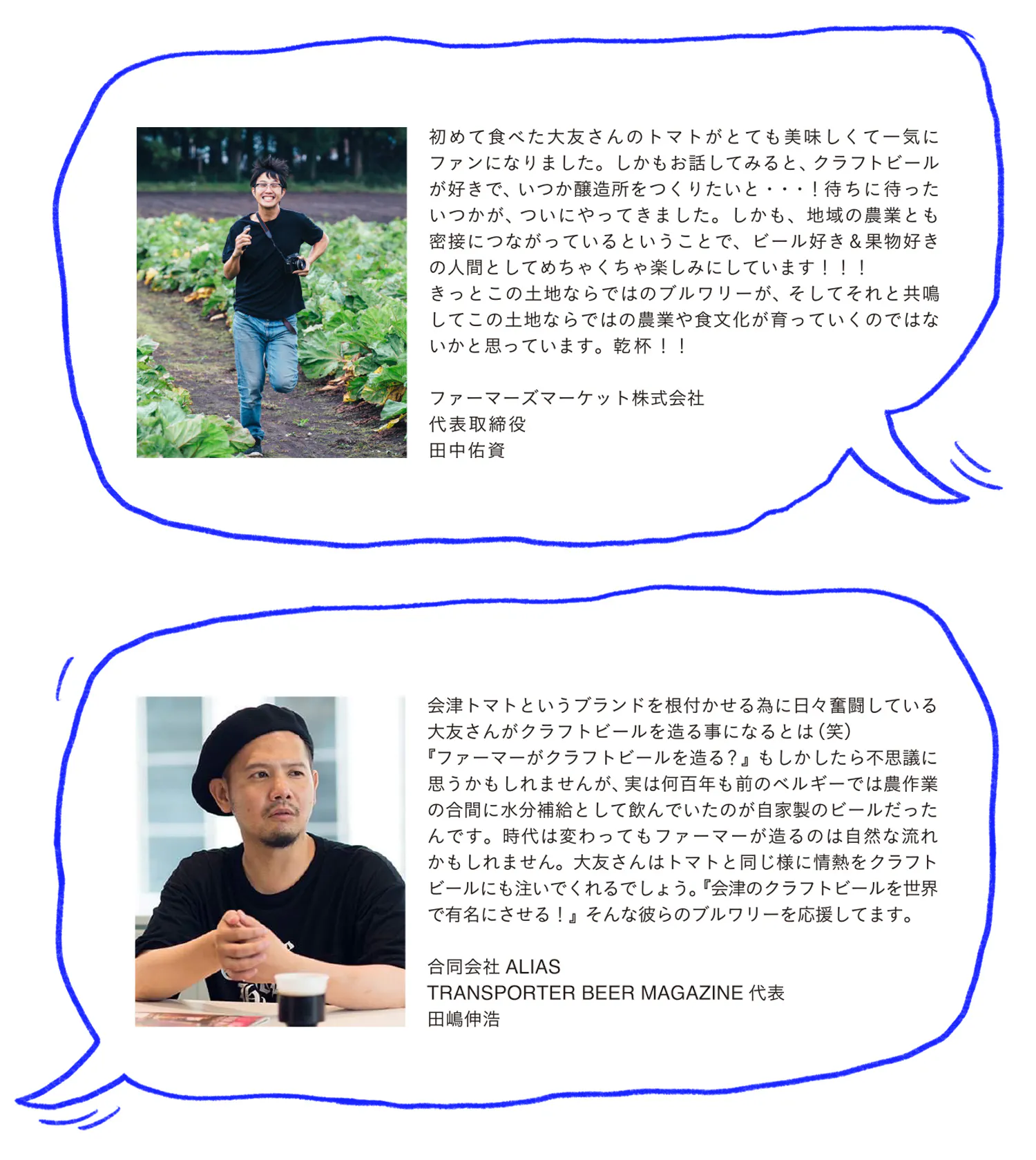 ロストマトの加工場を通じて他のトマト農家さんとの繋がりが生まれたように、ビール造りという新しい軸を持つことで、様々な生産者の方とさらに繋がりが生まれることを期待しています。色々な方とビールという受け皿を使って新しい挑戦をしていき、農作物の枠を超えて、会津の美味しさを全国の幅広い消費者の方に届けたいです!